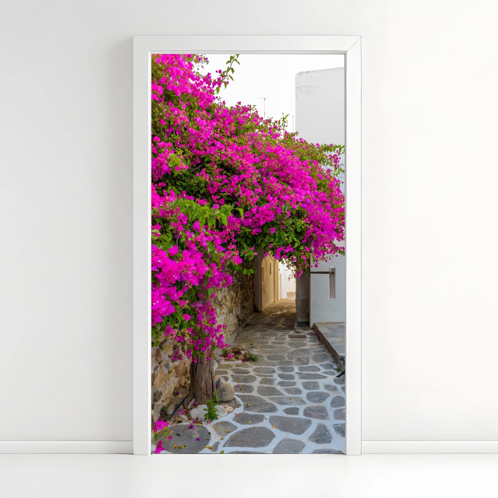 Door sticker Blooming bougainvillea in Naousa alley