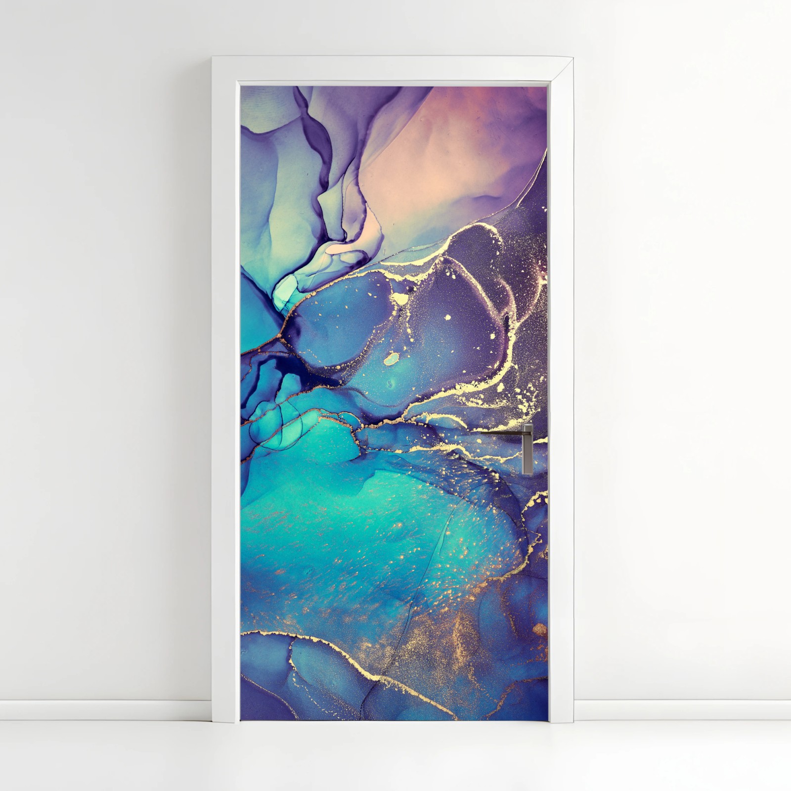 - abstract, wall art, turquoise, blue, marble texture, purple, gold accents, modern decor, fluid art, alcohol ink