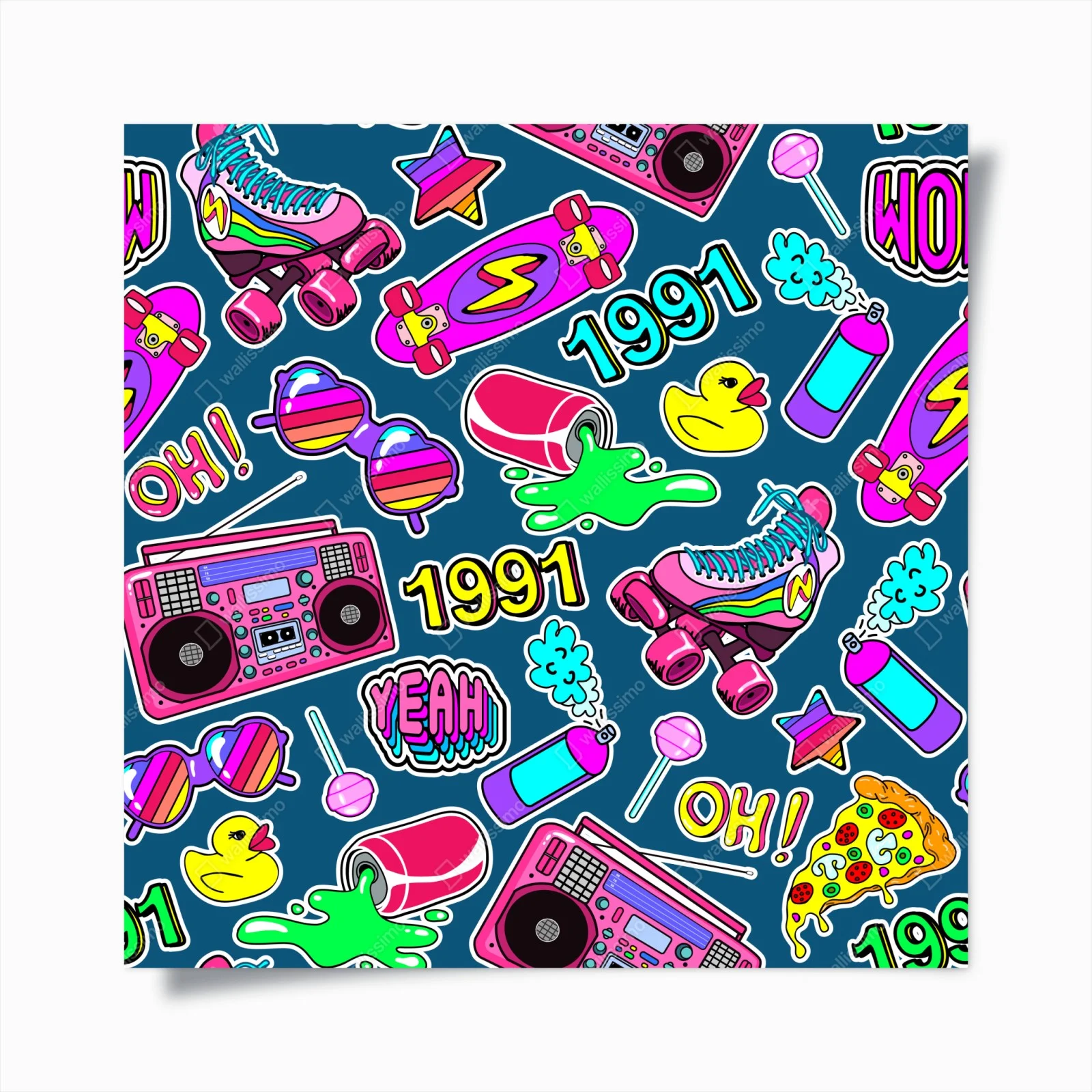 - colorful, retro, pop art, graffiti, neon, stickers, skateboard, 90s, roller skates, boombox