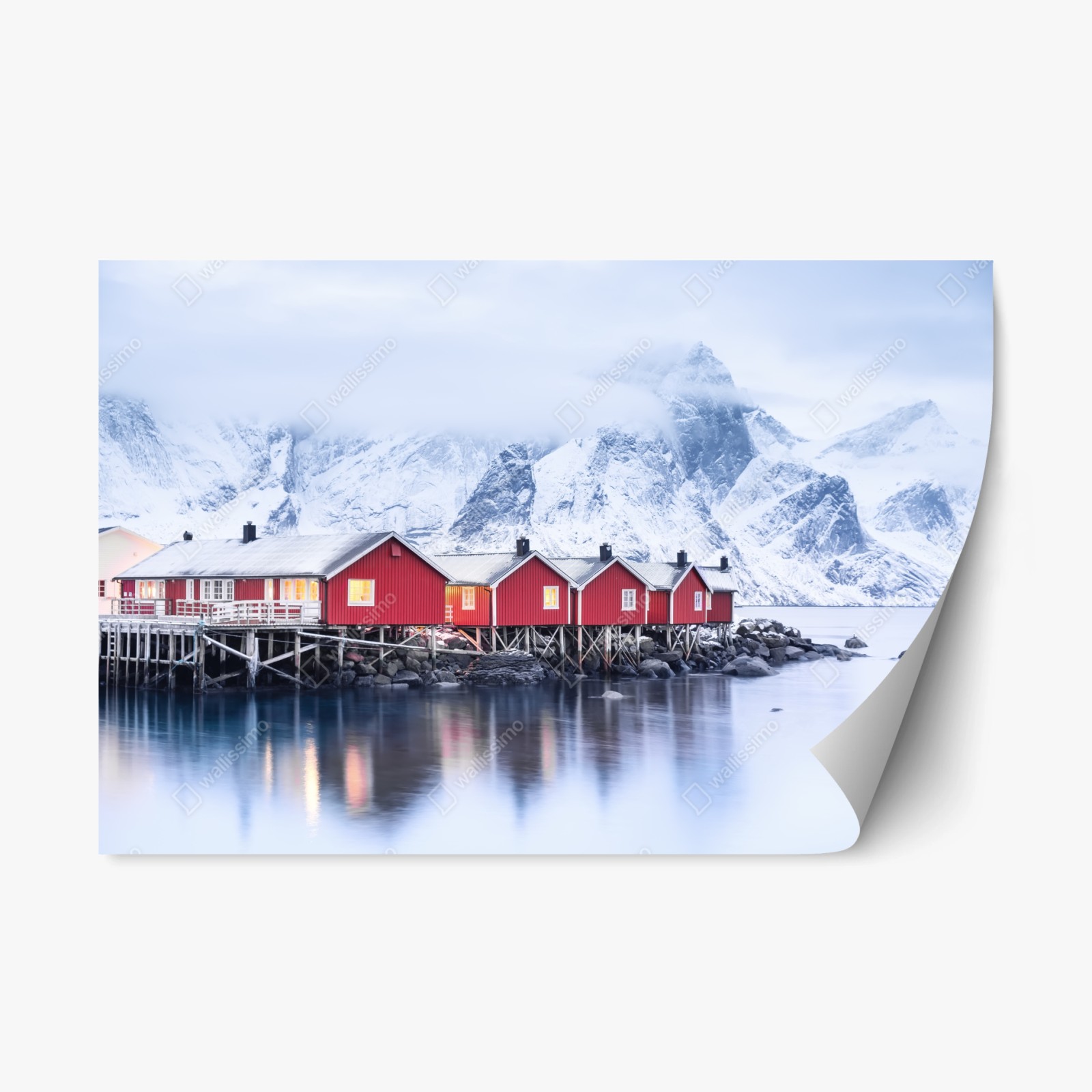 Repositionable sticker Sunrise over Lofoten red cabins