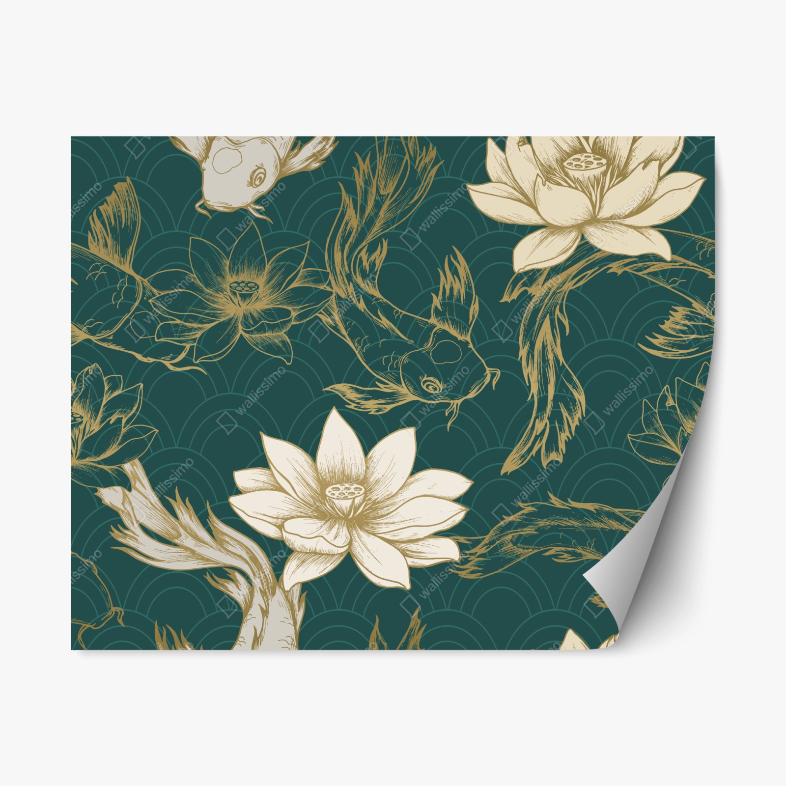 Repositionable sticker Oriental koi and lotus pattern in teal and gold