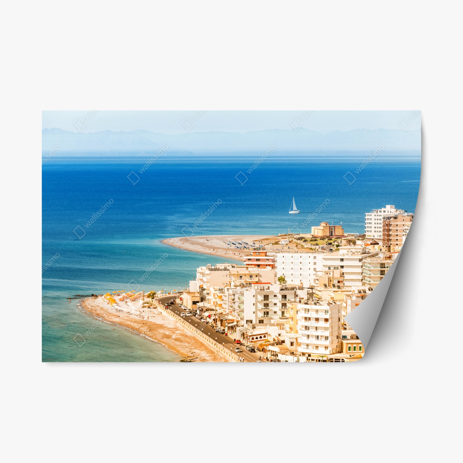 Repositionable sticker Sunny coastal cityscape with sailboat