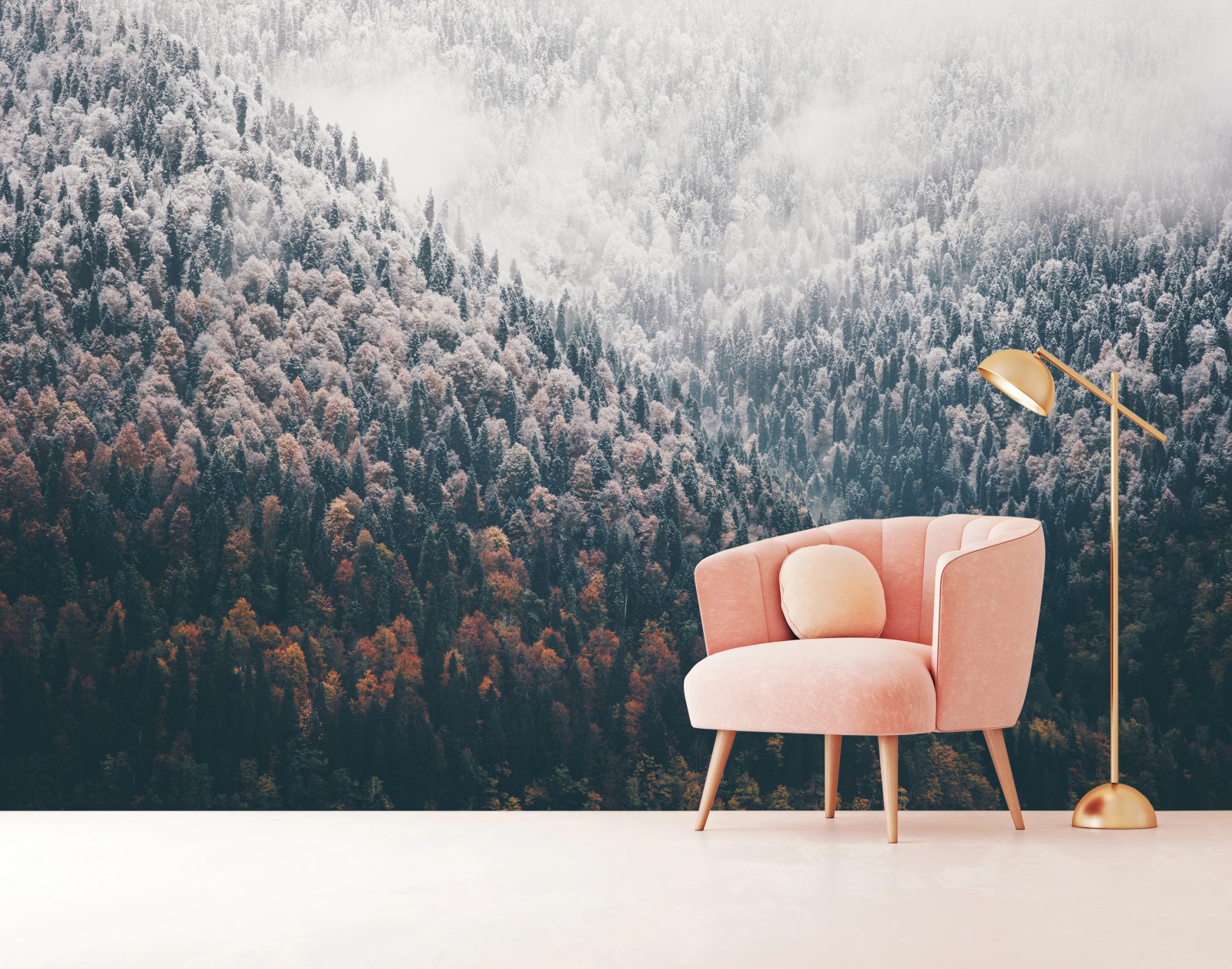 Wall mural Misty autumn forest on snowy mountain