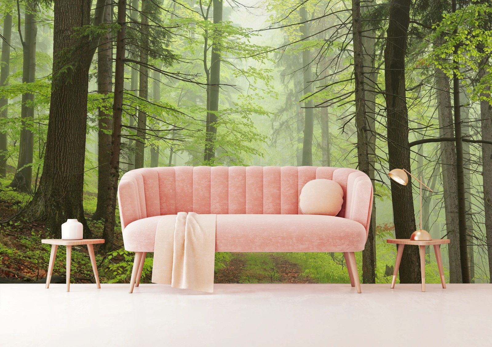 Wall mural Misty green forest trail
