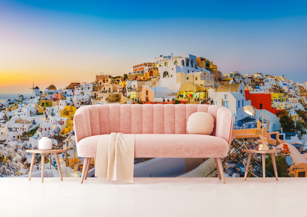 Wall mural Sunset over Santorini village panoramic view