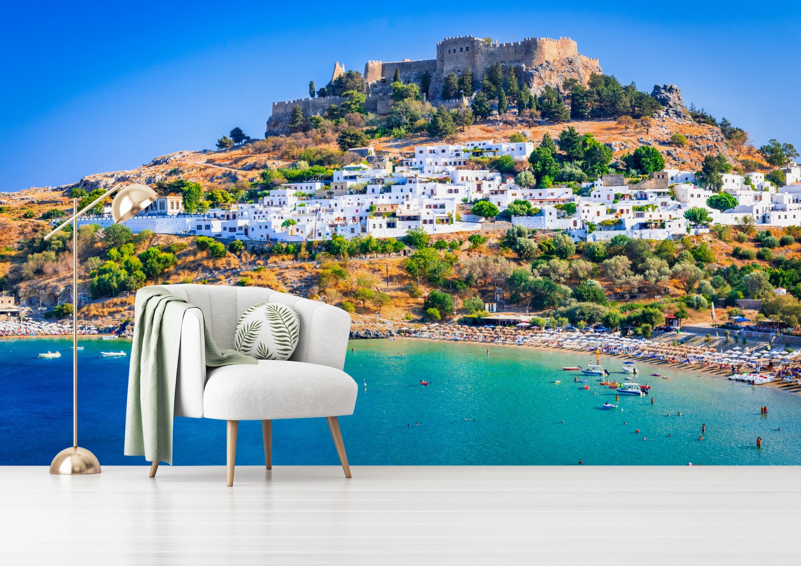 - travel, beach, turquoise water, mediterranean, white houses, seaside, rhodes, greek island, lindos, acropolis