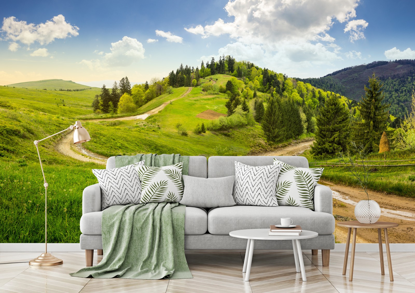 - panorama, forest, meadow, landscape, countryside, fence, country road, hills, green valley, cloudy sky