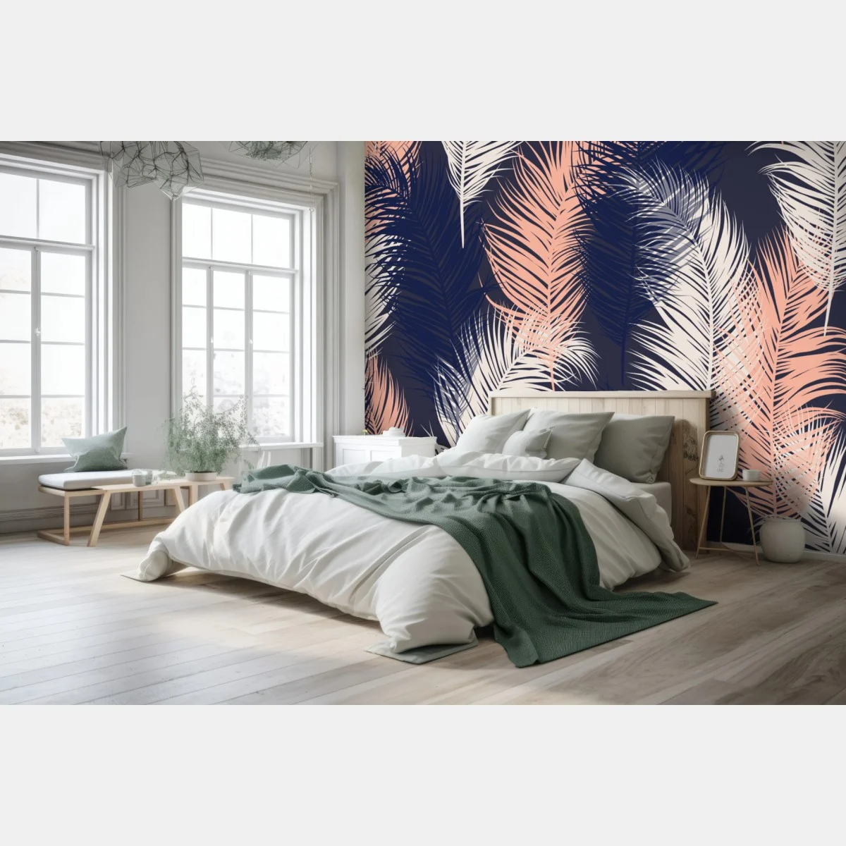 Elegant navy and blush feather pattern brings soft, boho-inspired charm to any room and creates a calming, stylish atmosphere.MoreLess