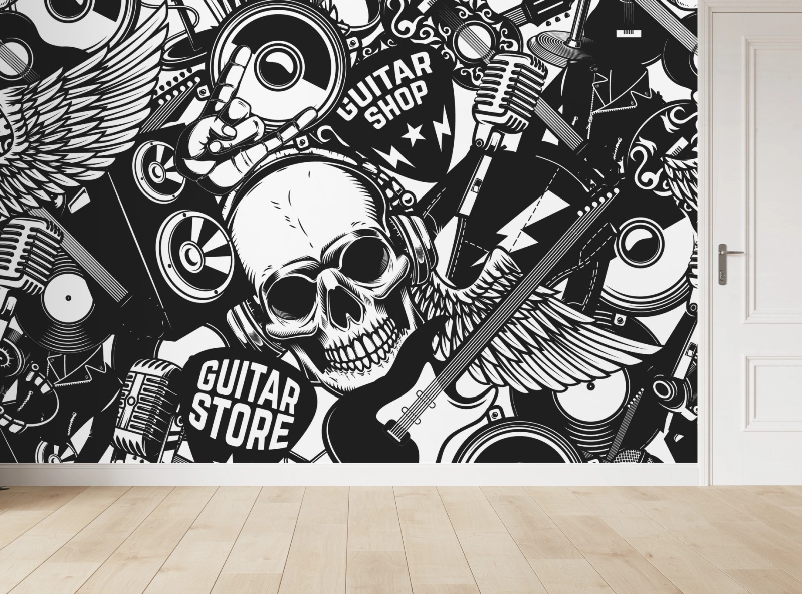 Bold monochrome seamless pattern of skulls, guitars, vinyl records and vintage microphones for edgy music-themed decor.MoreLess