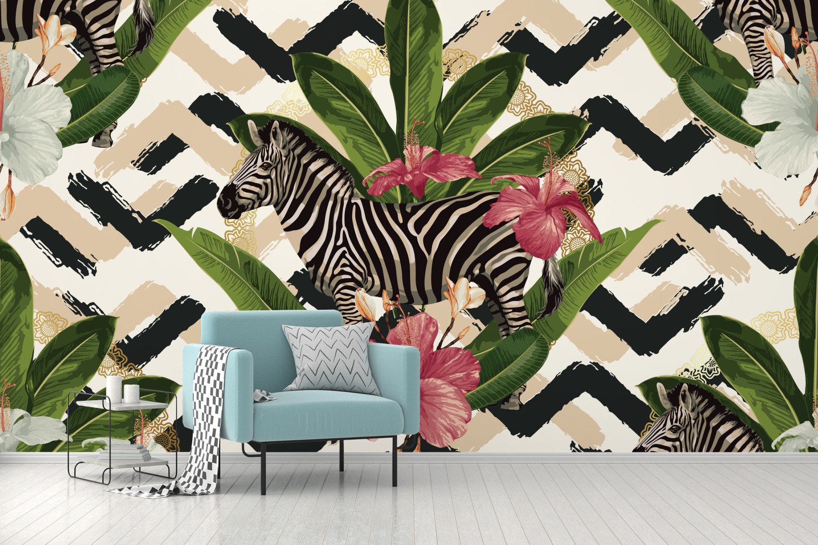 Wall mural Vintage tropical zebra pattern with hibiscus