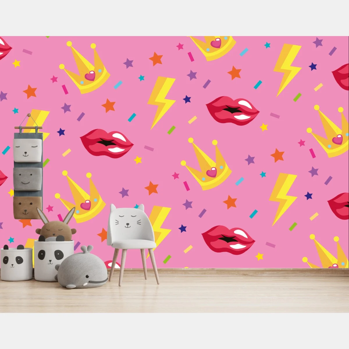 - seamless pattern, pop art, stars, lips, decorative wallpaper, pink pattern, princess crown, lightning bolt, confetti, girly design