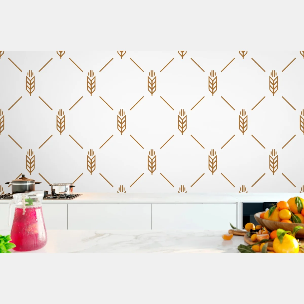 - minimalist, seamless pattern, geometric, farmhouse, kitchen decor, wheat pattern, natural motif, gold icons, white background, repeating design