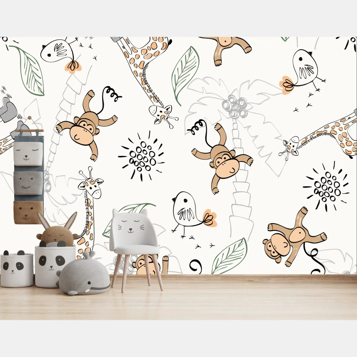 playful jungle animals pattern featuring monkeys, giraffes and birds adds a cheerful touch to any kid's room.MoreLess