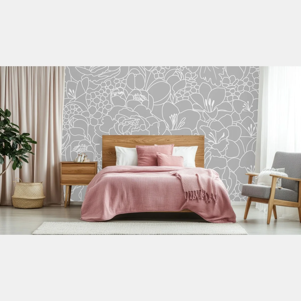 Elegant monochrome floral pattern with delicate white outlines on a gray background, perfect for adding a calm, modern touch to any room.MoreLess
