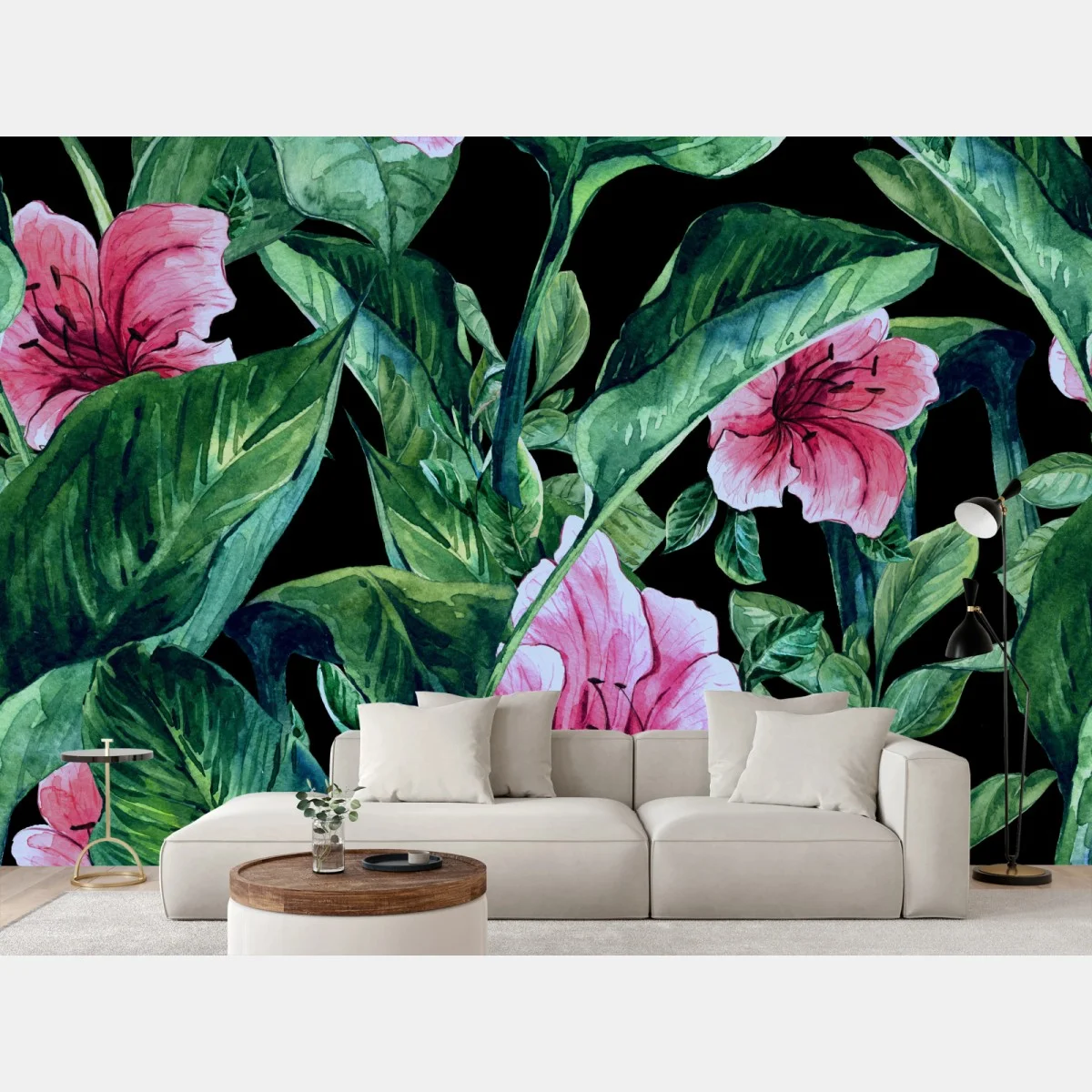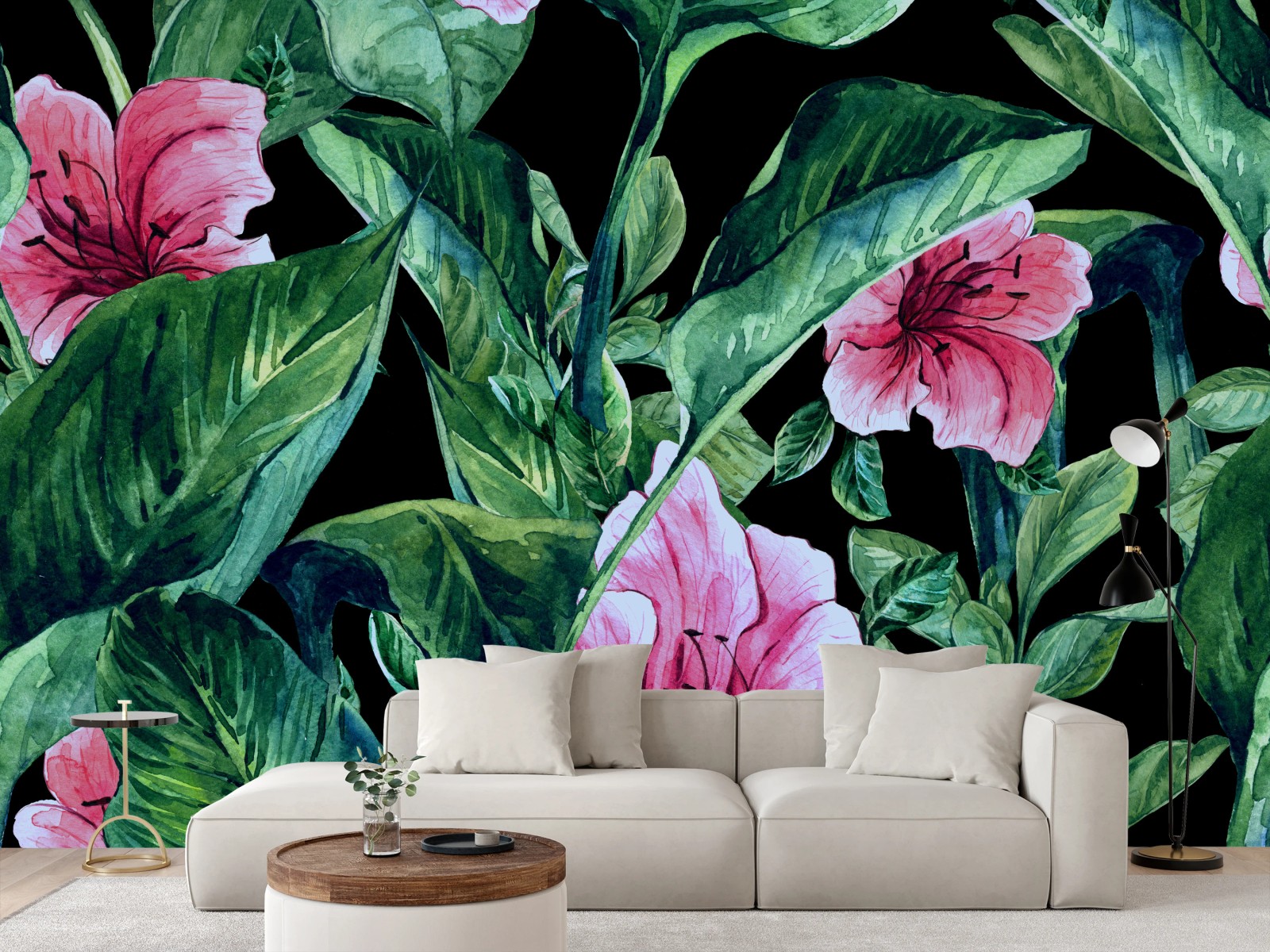 - botanical, pattern, wall art, tropical, floral, seamless, flowers, green leaves, watercolor, decorative