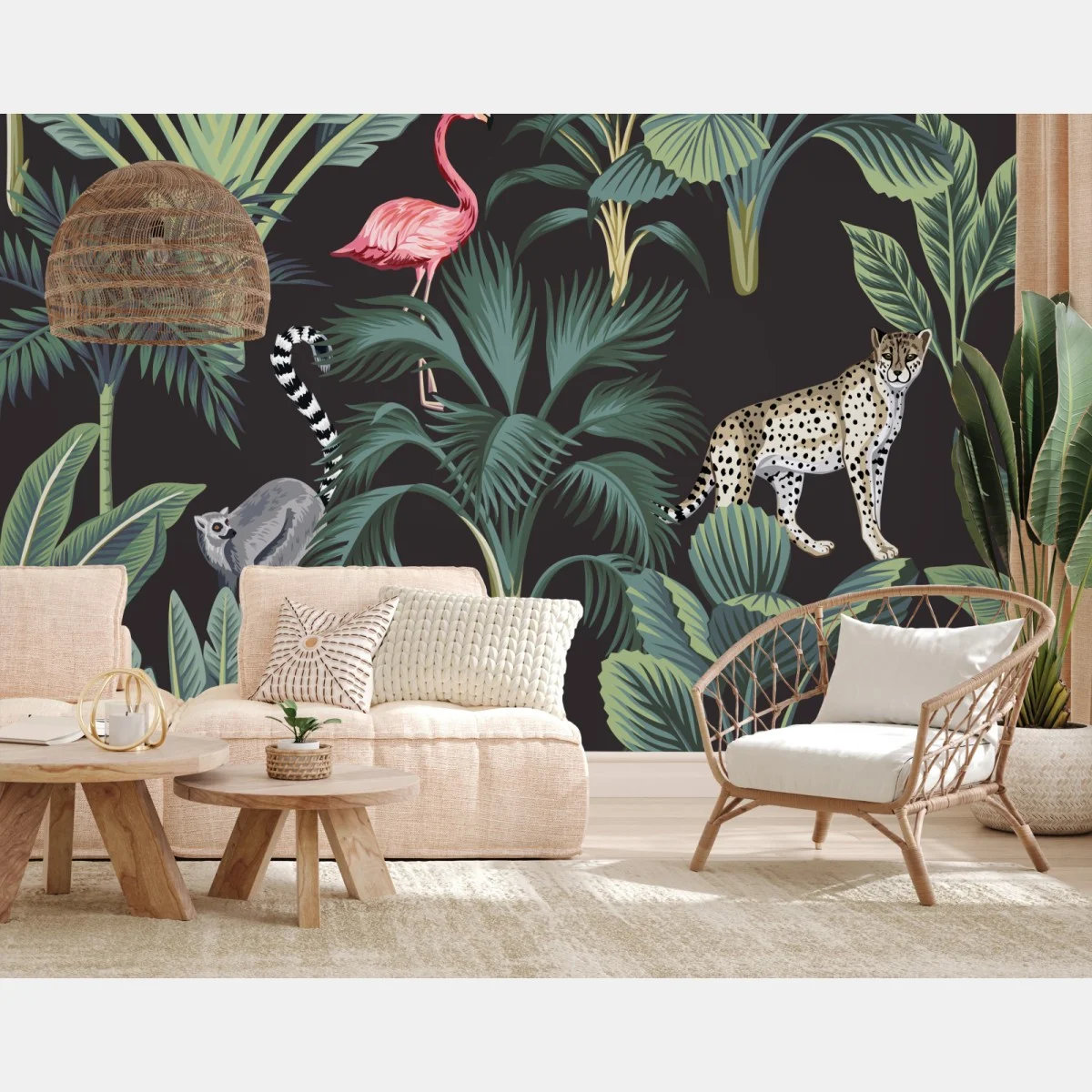 Bring exotic jungle vibes to your space with vibrant tropical foliage and illustrated wildlife in a bold decorative pattern.MoreLess