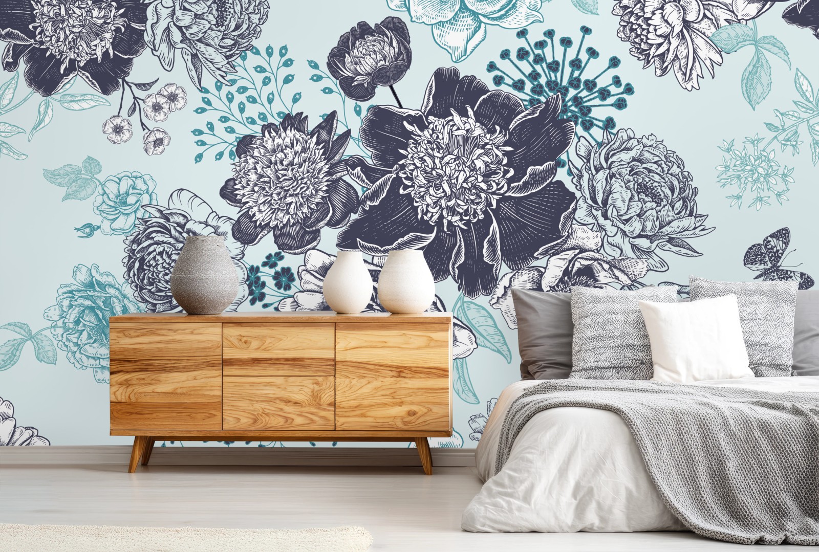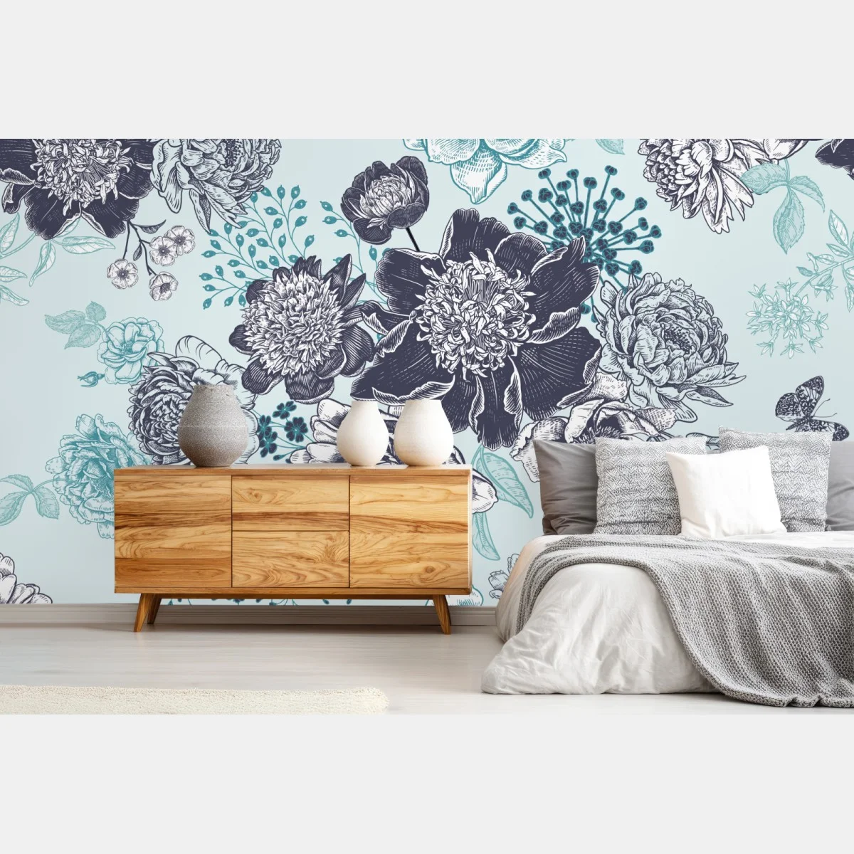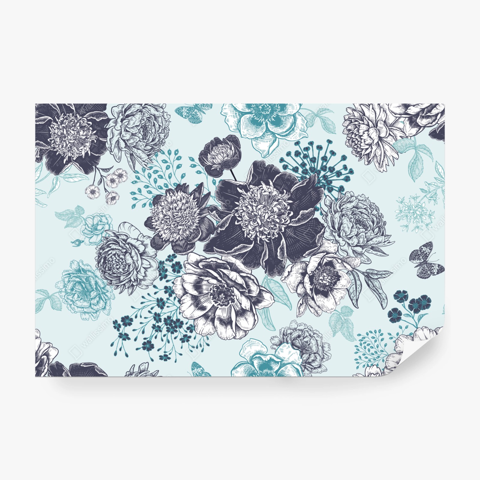 - botanical, pattern, floral, flowers, ornamental, vintage, turquoise, hand-drawn, teal, butterfly