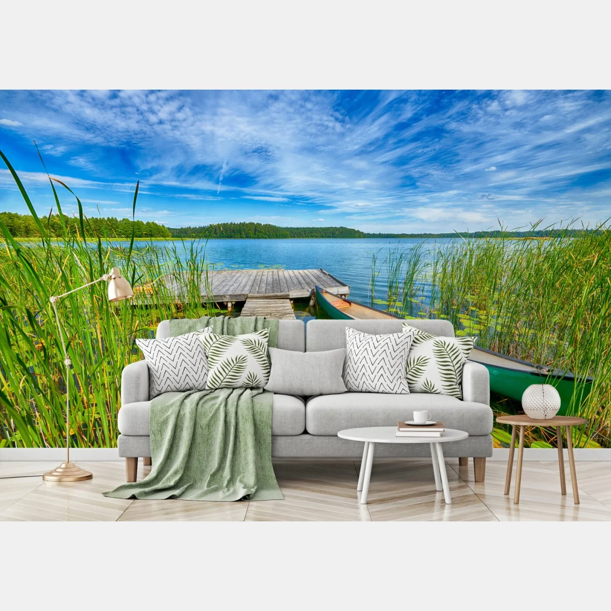 - nature, summer, lake, blue sky, calm, wooden dock, masuria, water lilies, reeds, canoe