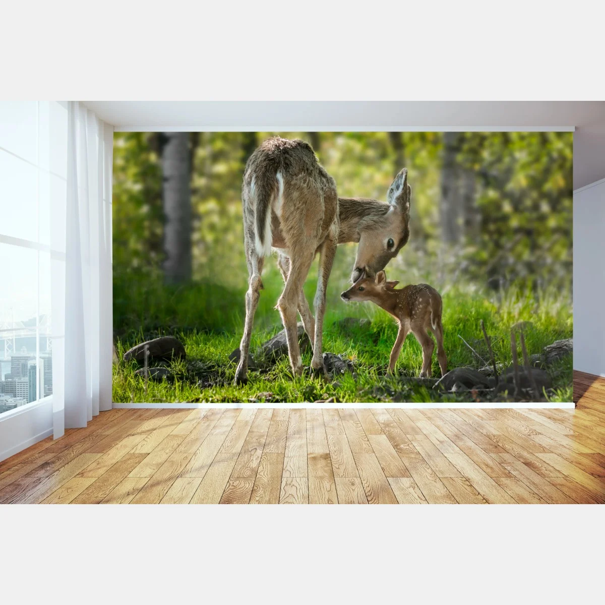 Wall mural Mother deer and fawn in a sunlit forest