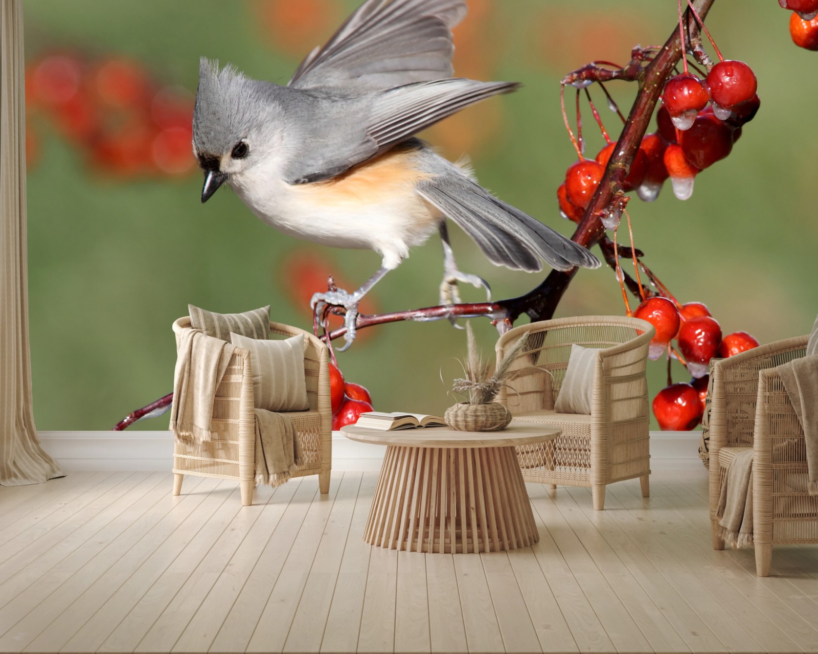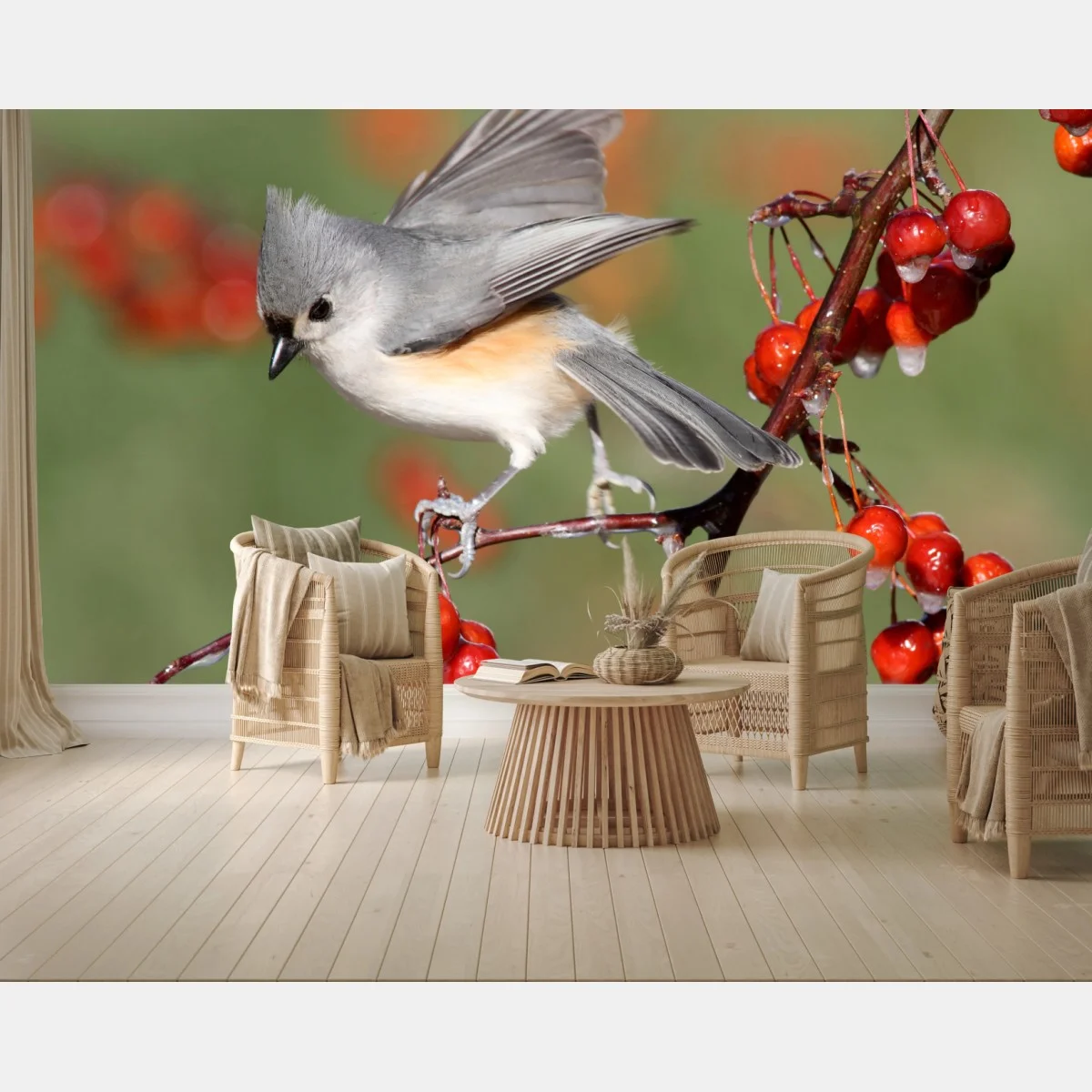 Wall mural Gray titmouse on red berries