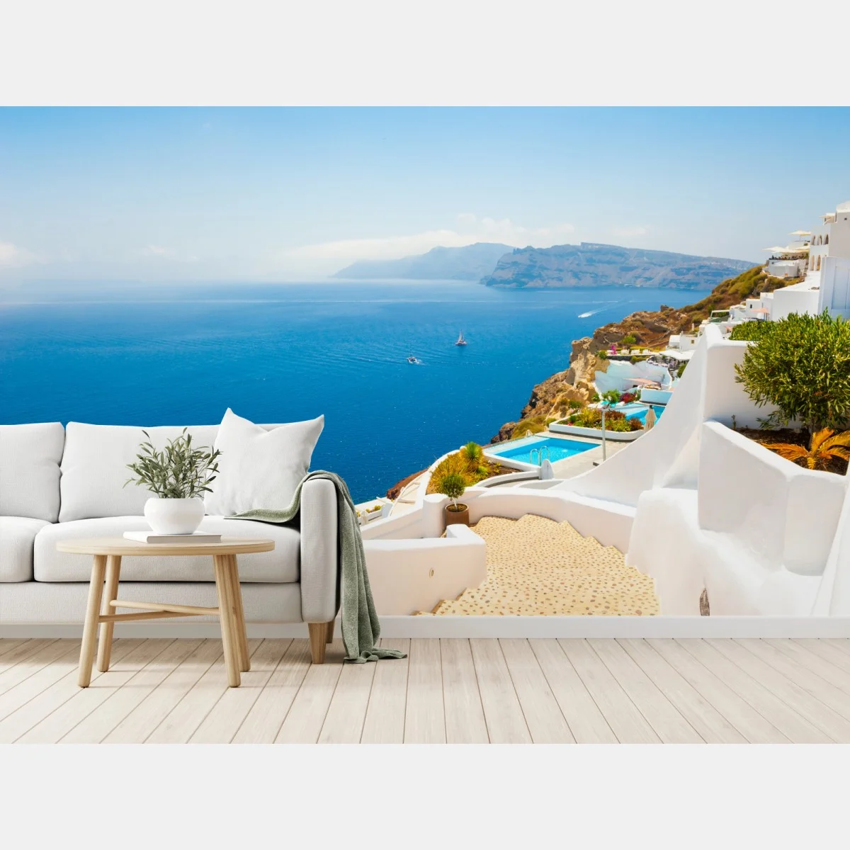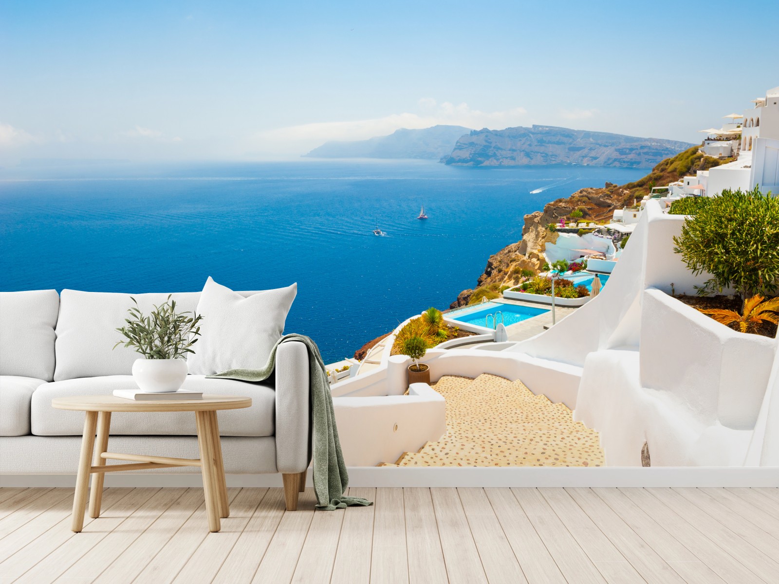 - summer, blue sky, island, sea, ocean, greece, mediterranean, santorini, white houses, cliffside
