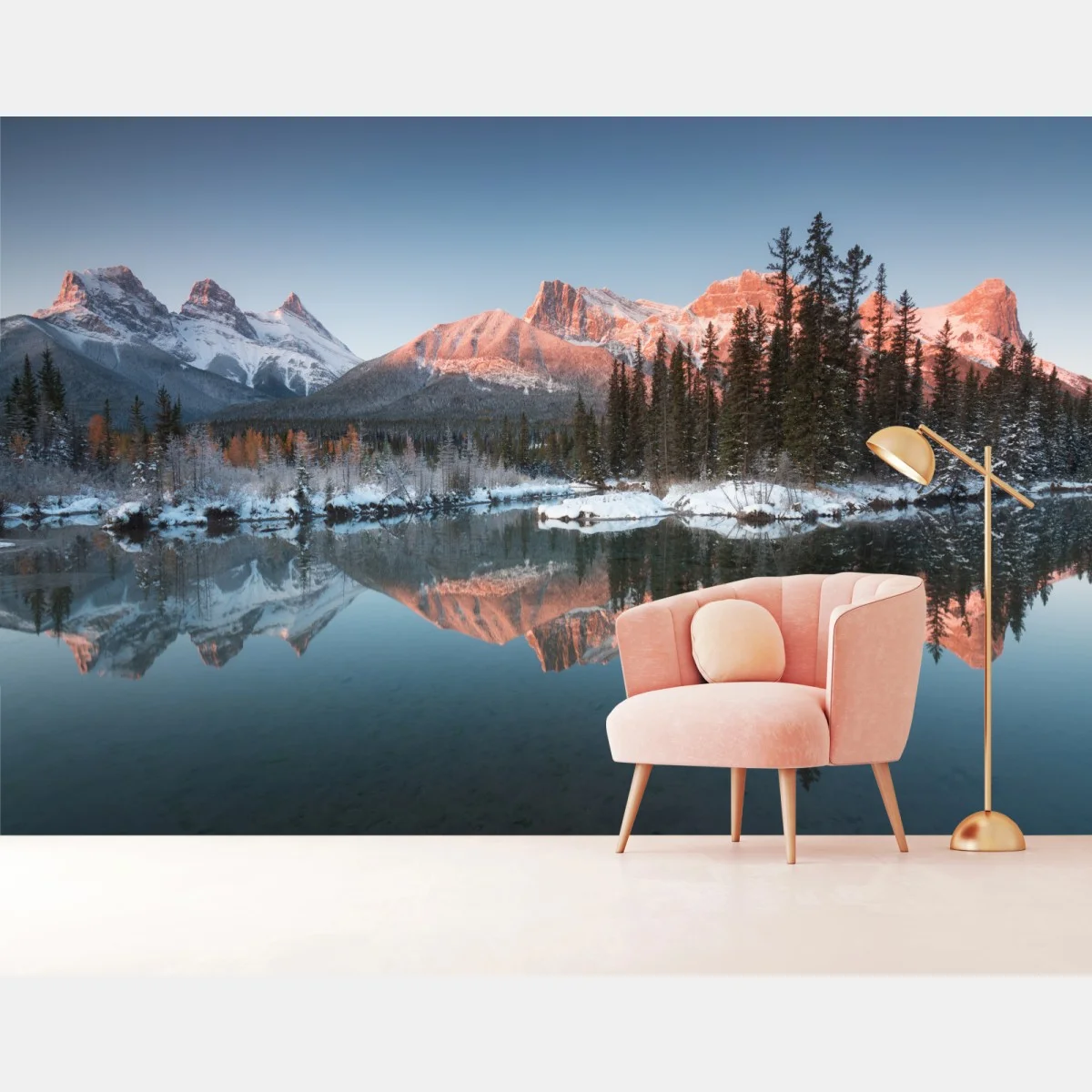 Wall mural Sunlit mountain reflection at dawn