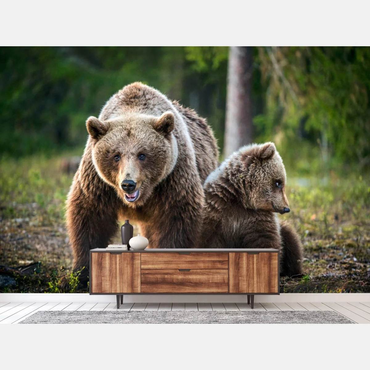 Wall mural Brown bear mother with cub in forest