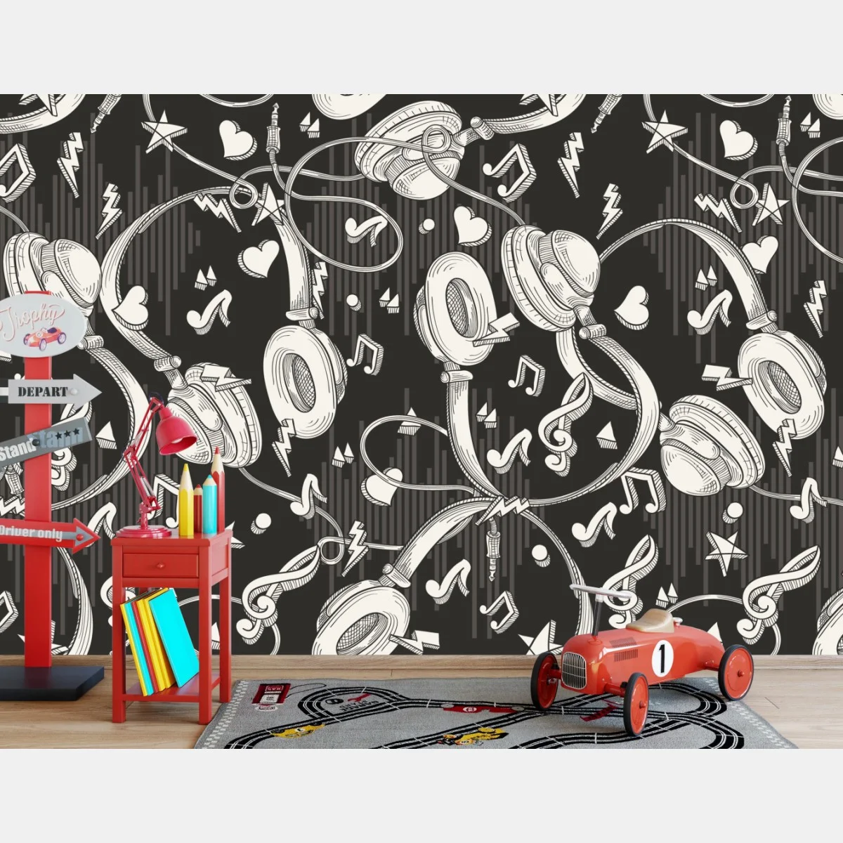 - music, headphones, wallpaper, pattern, seamless, monochrome, retro, doodle, musical notes, audio