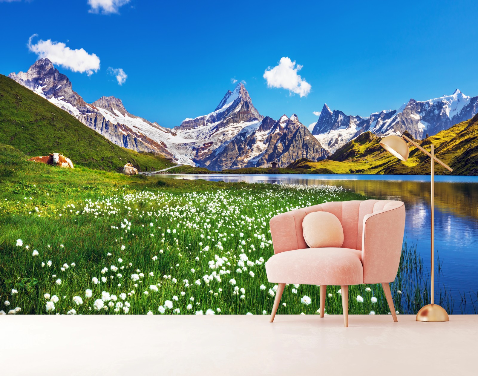 Breathtaking alpine scene featuring a crystal lake, soaring peaks and a meadow of white wildflowers — perfect for bringing calm natural beauty to any room.MoreLess