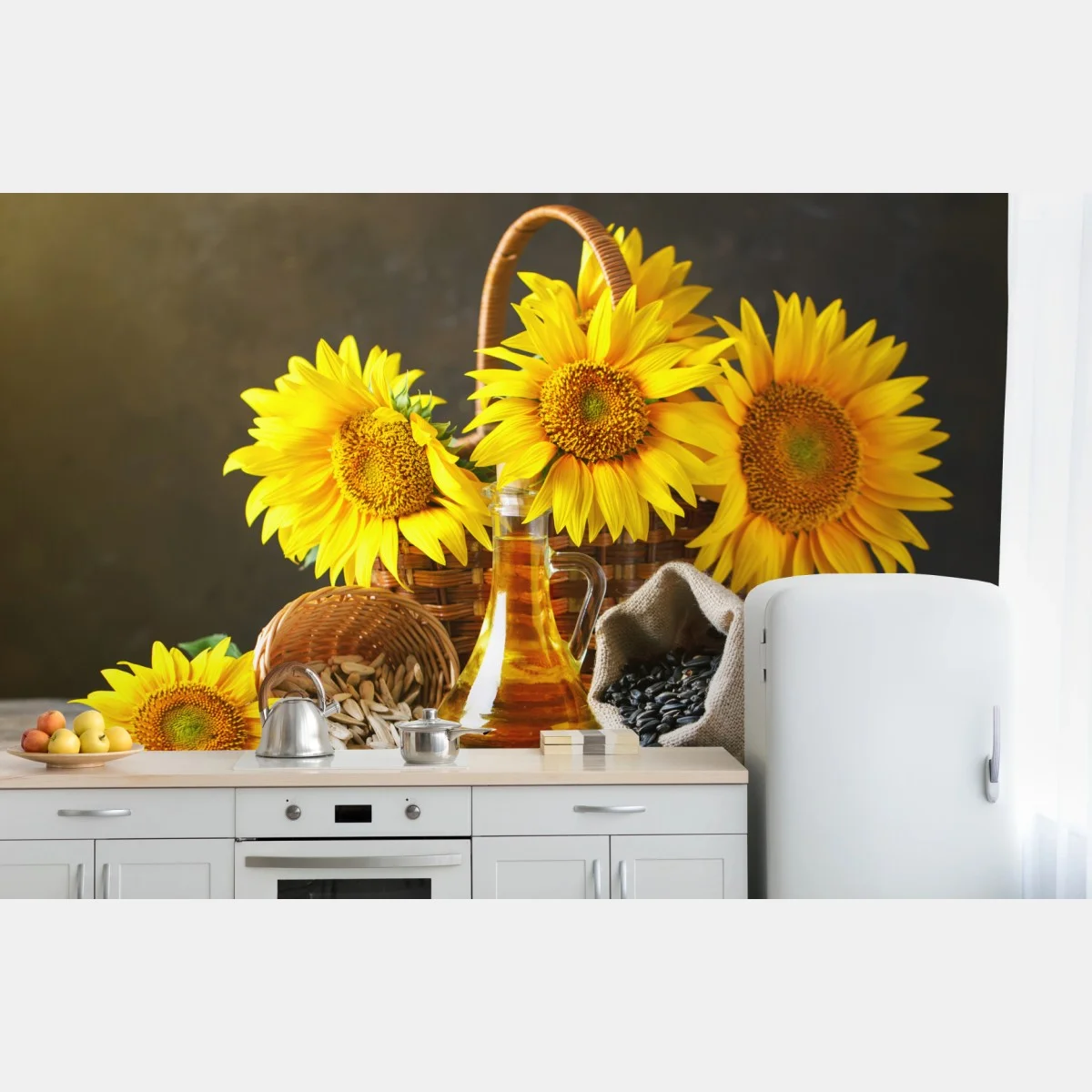 Wall mural Bright sunflower still life with seeds and oil