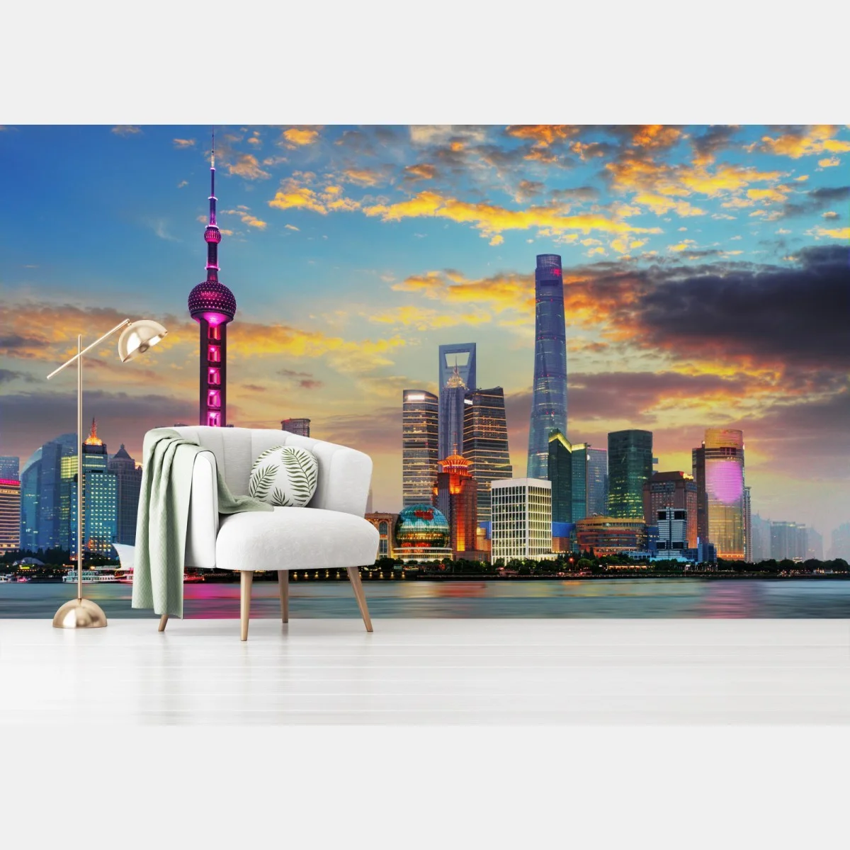 - skyline, cityscape, skyscrapers, sunset, modern architecture, waterfront, evening lights, reflections, shanghai, oriental pearl tower