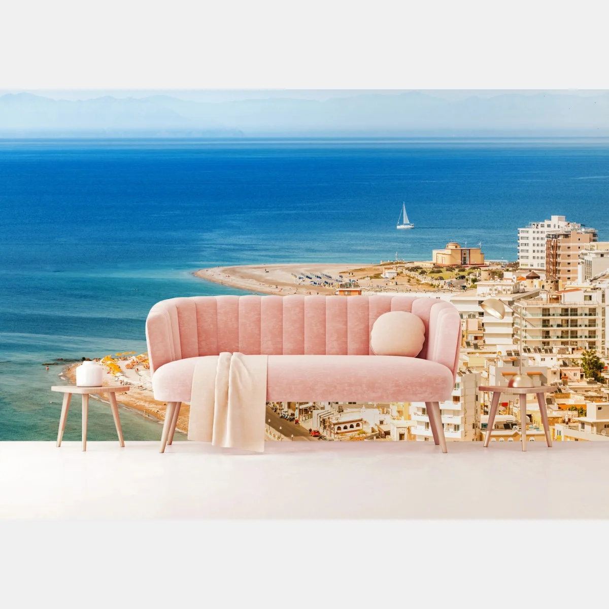 Wall mural Sunny coastal cityscape with sailboat