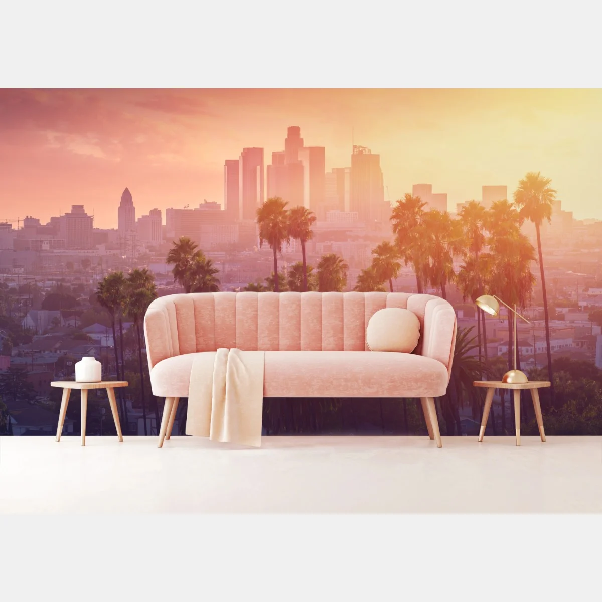 - urban, panorama, travel, sunset, palm trees, city skyline, golden hour, downtown, los angeles, california