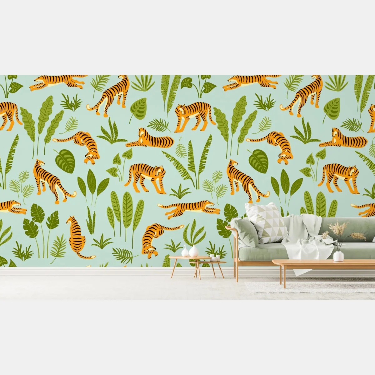 - seamless pattern, exotic, tiger, tropical leaves, jungle pattern, green foliage, vector art, kids wallpaper, animal illustration, playful design