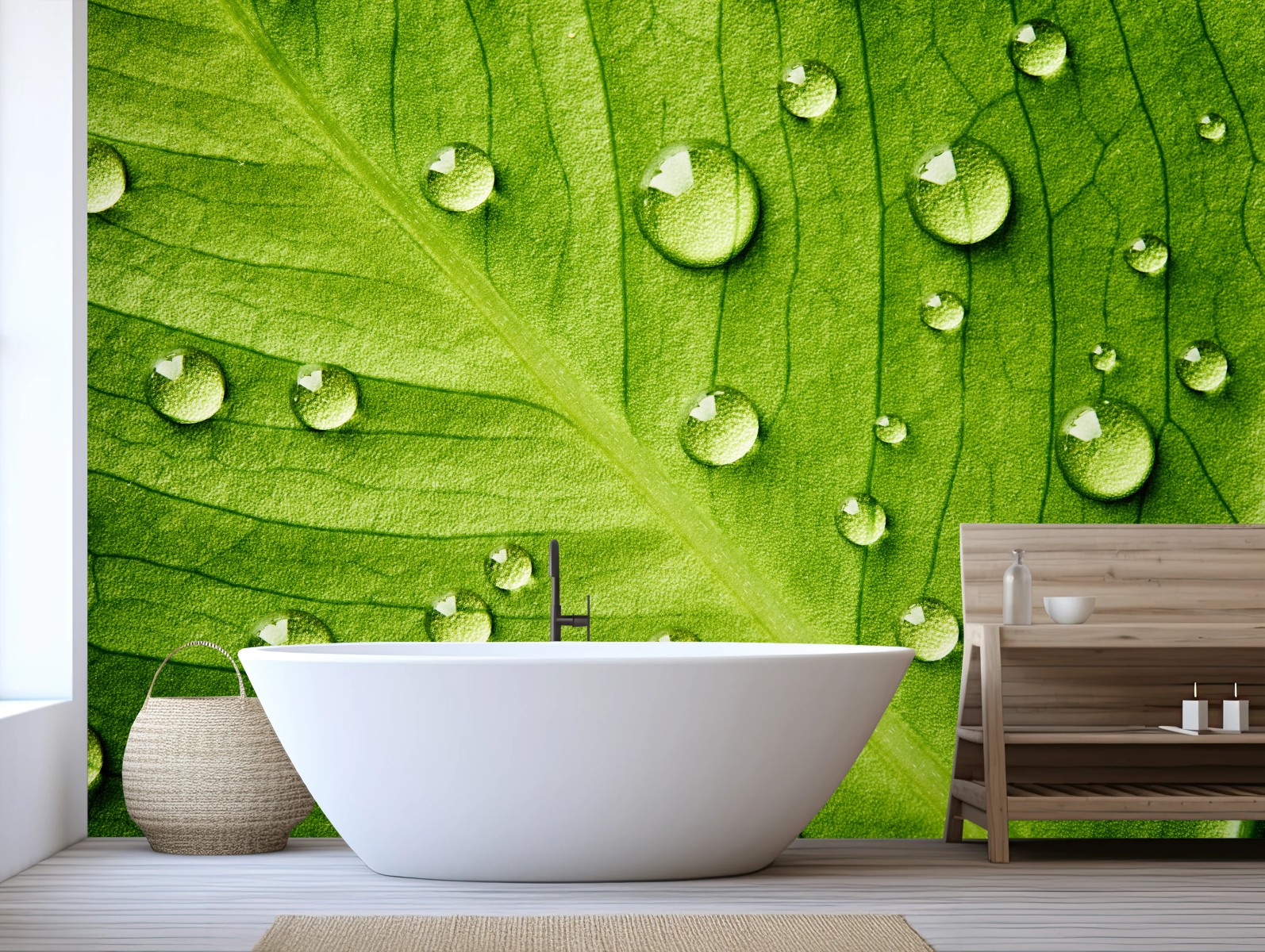 Wall mural Fresh green leaf with water droplets