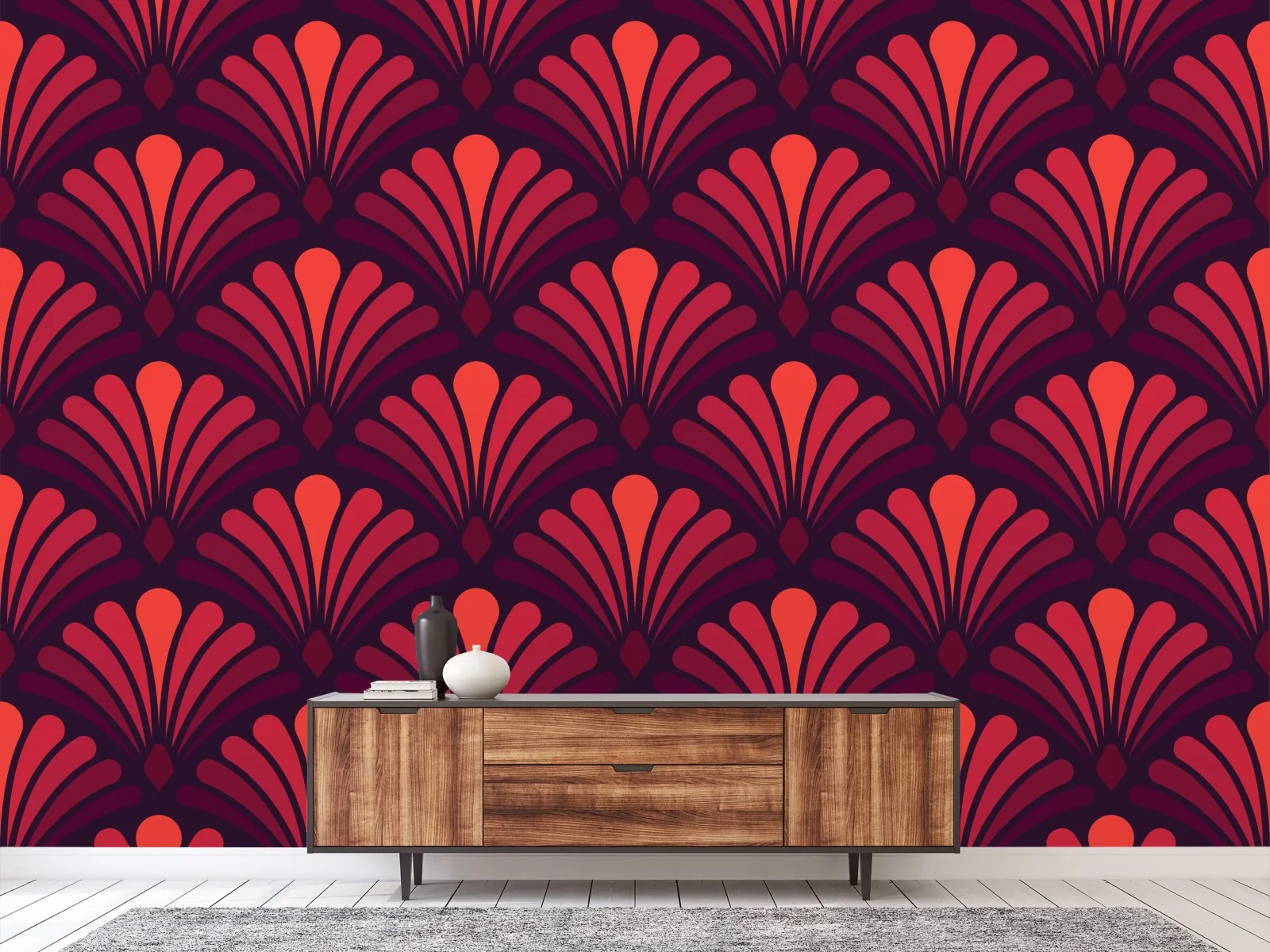 Wall mural Art deco fan pattern in coral and burgundy