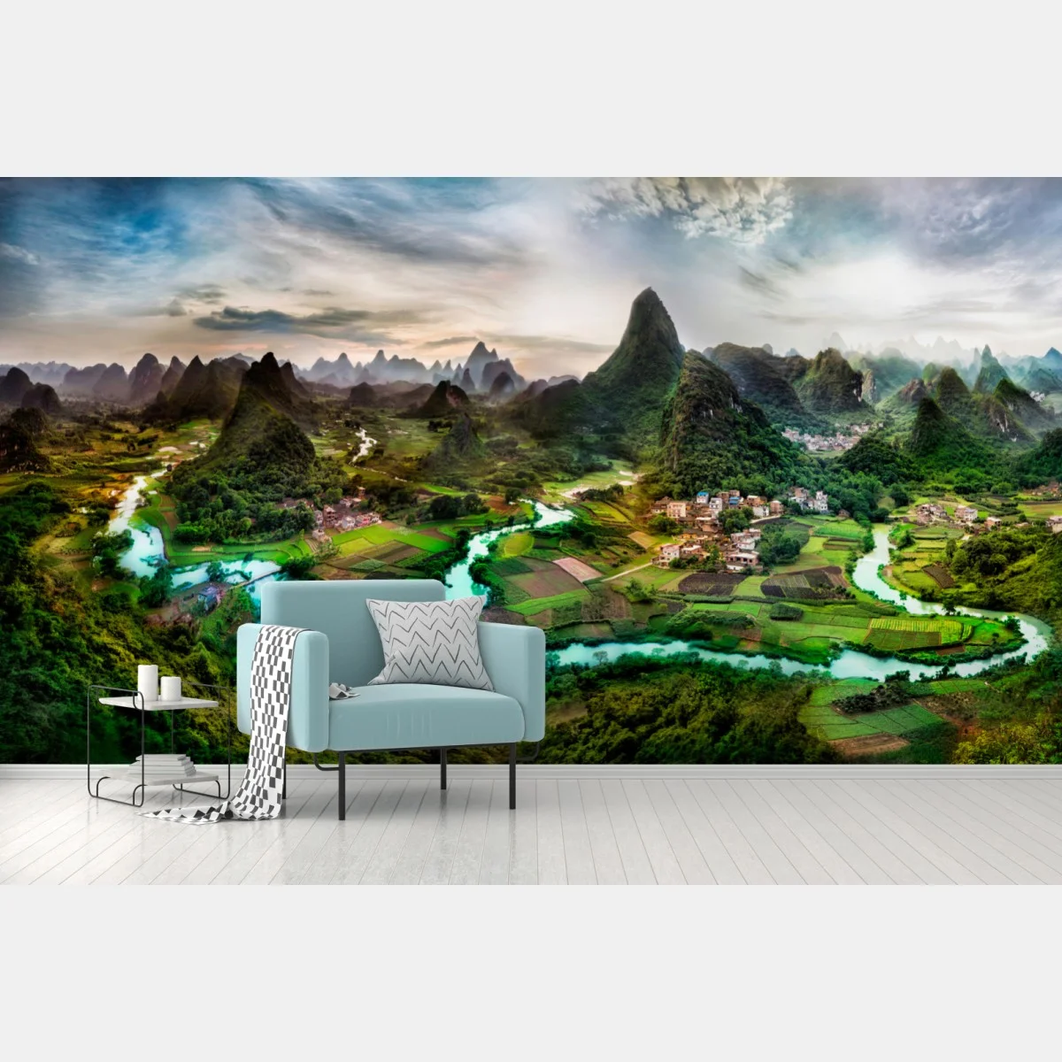 Wall mural Emerald river through karst mountains panorama