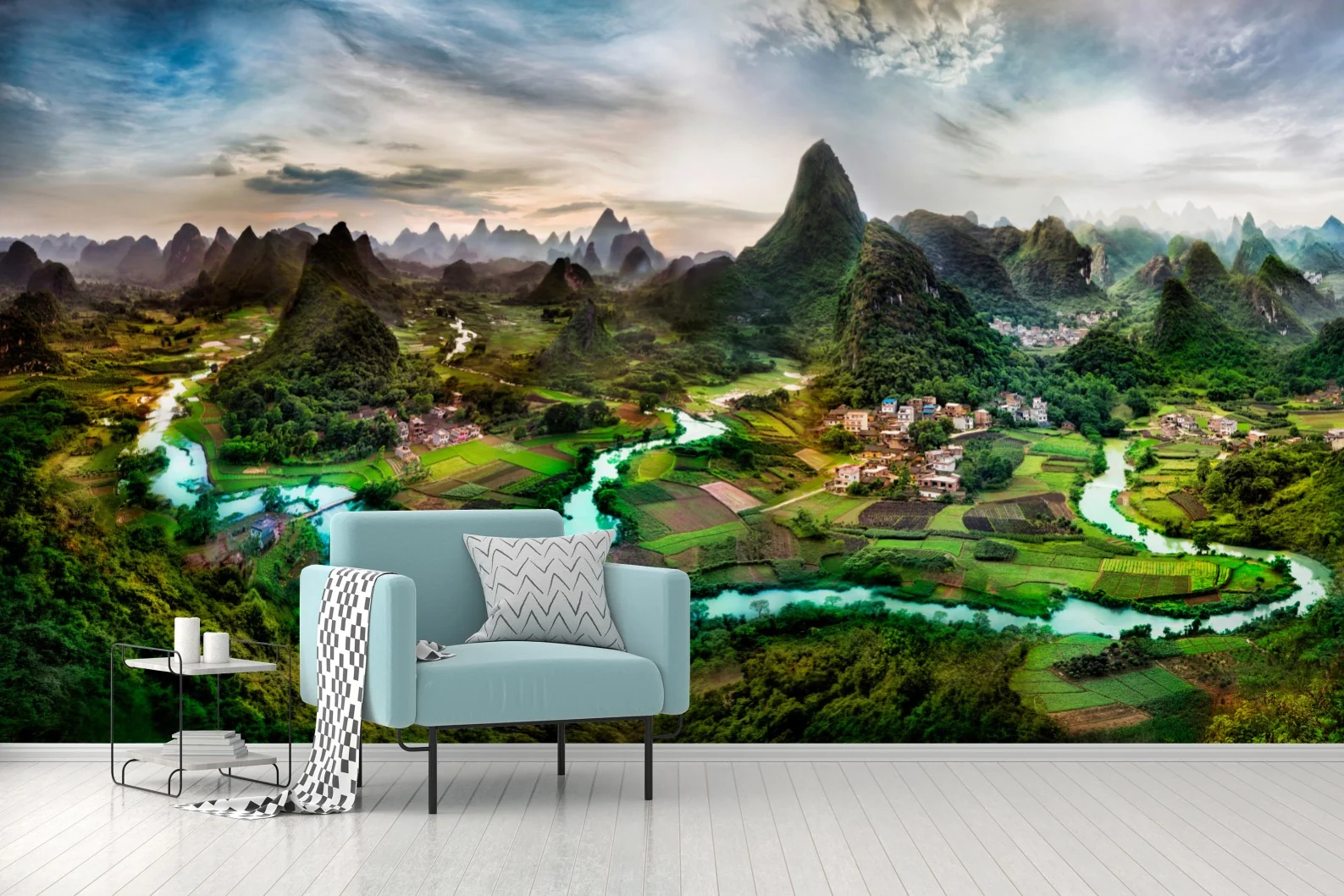 - nature, mountains, scenic, sunset, river, panoramic, green fields, village, valley, karst landscape