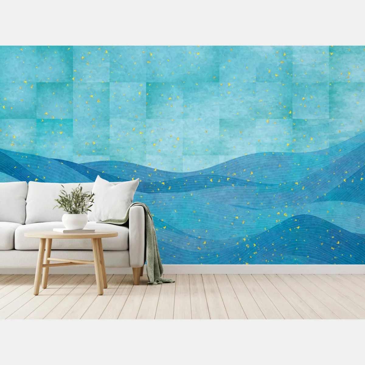 - pattern, minimalist, abstract, watercolor, turquoise, waves, ocean, blue, textured, gold flecks