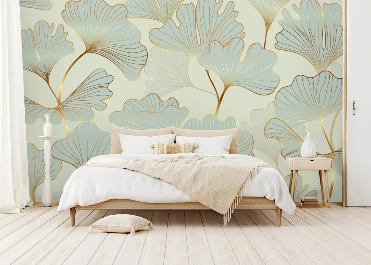 Wall mural Pastel ginkgo leaves pattern with gold accents