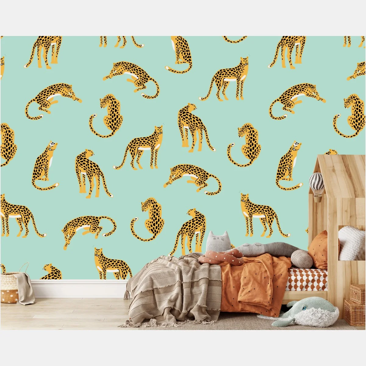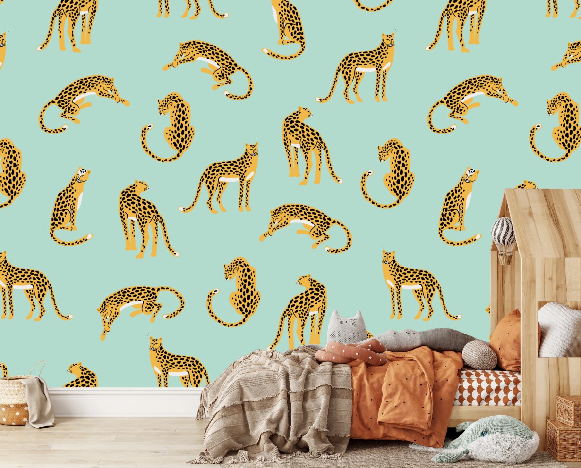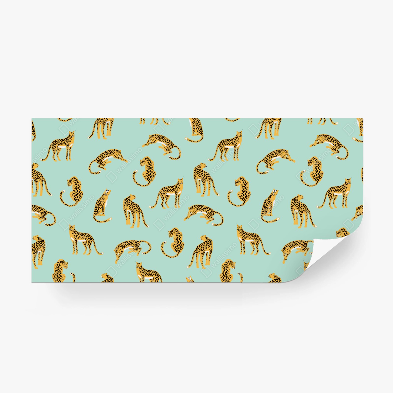 Bring a playful wild touch to your space with this seamless cheetah pattern on a soft turquoise background, perfect for children's rooms or modern interiors.MoreLess