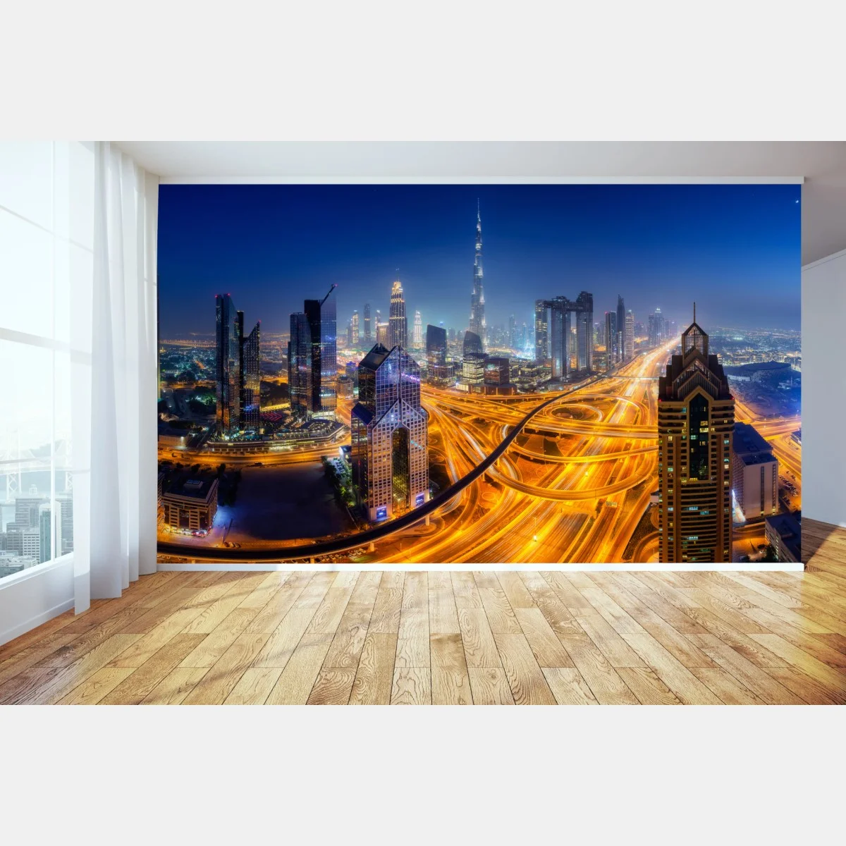 - skyline, cityscape, urban, skyscrapers, night, panoramic, dubai, burj khalifa, lights, highway