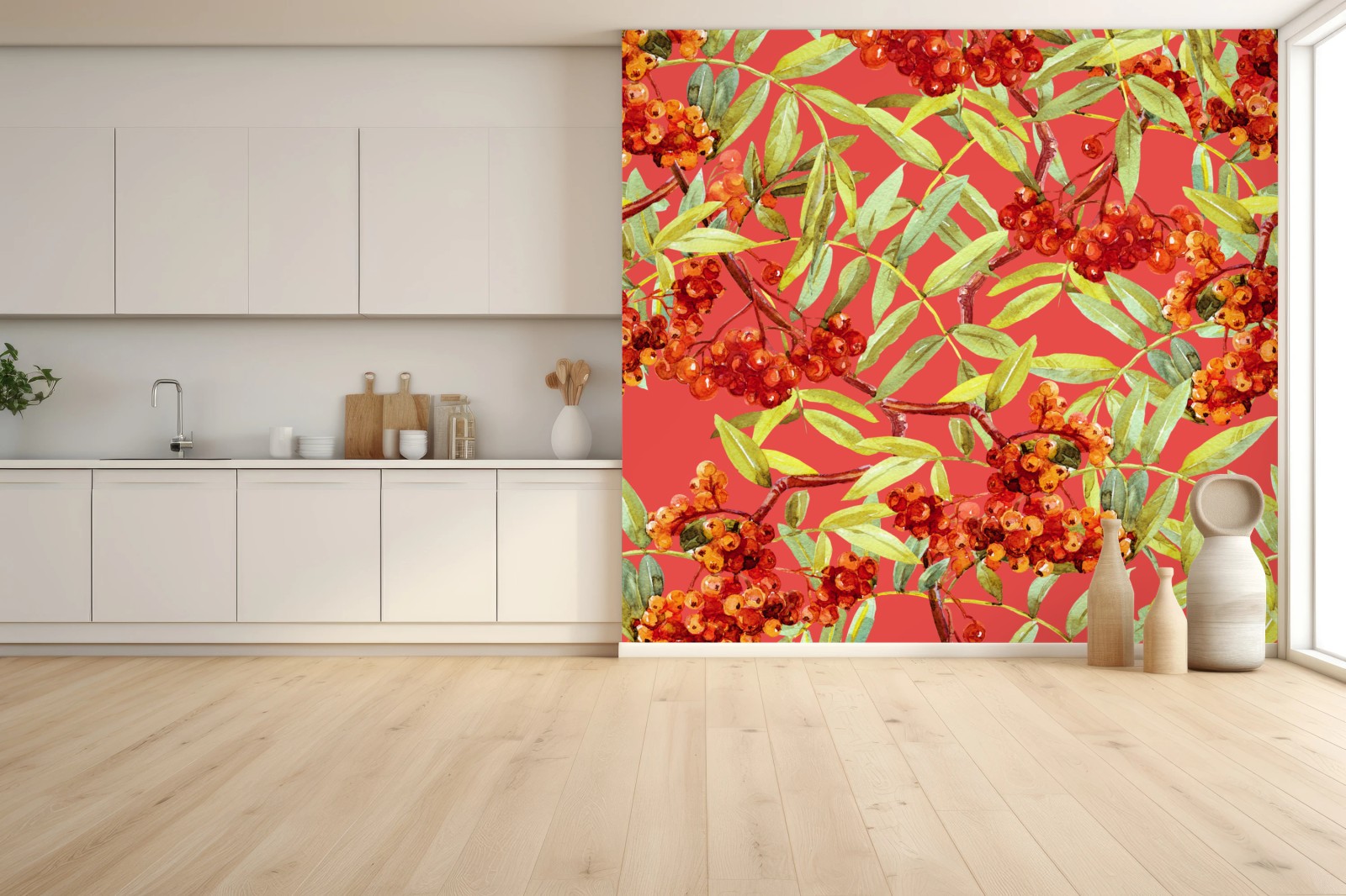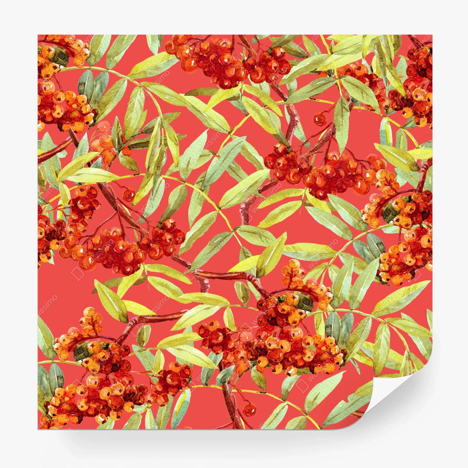 - botanical, seamless pattern, nature, floral, leaves, watercolor, berries, red berries, rowan, berries pattern
