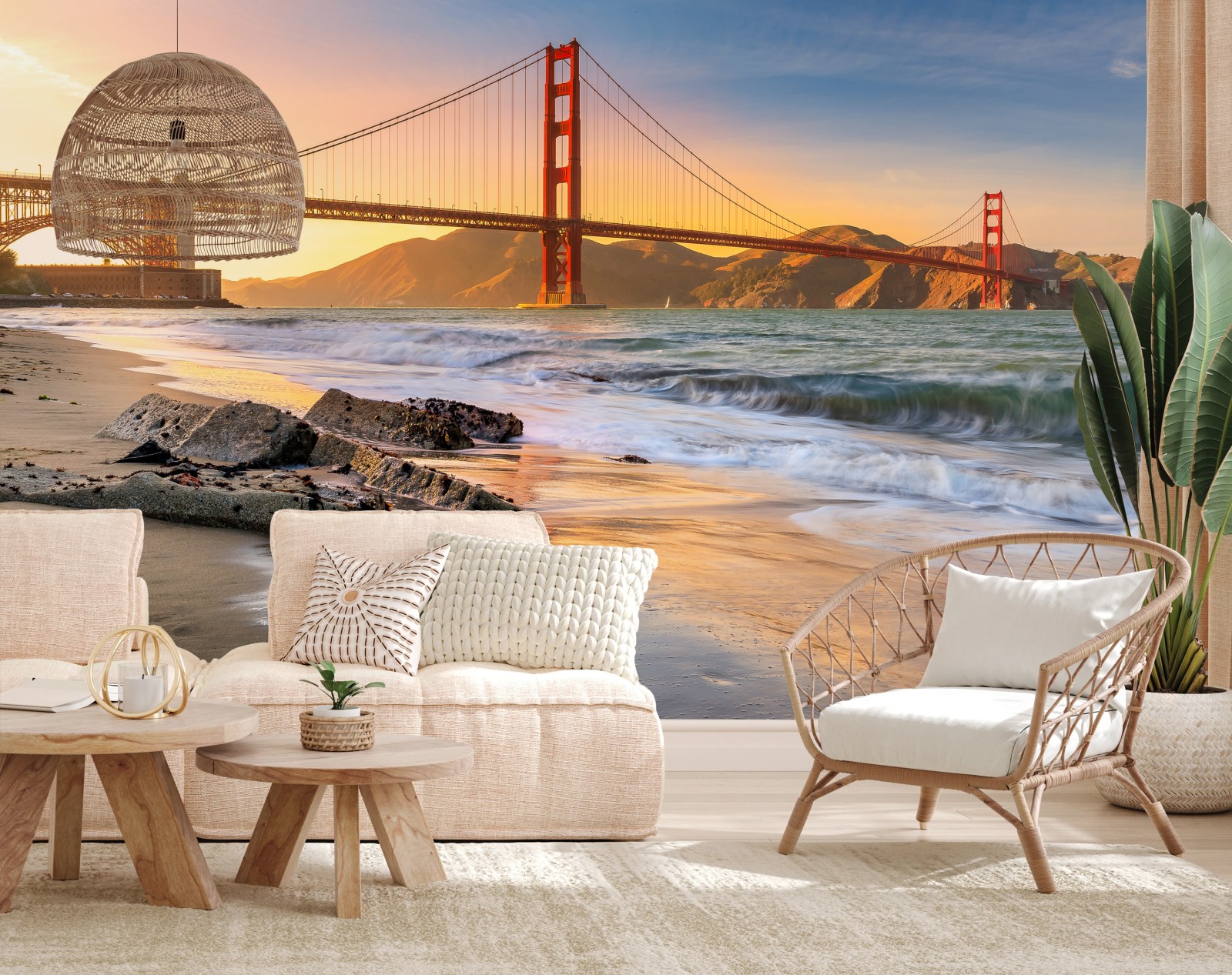 - sunset, waves, beach, coastline, seascape, long exposure, landmark, bridge, golden gate bridge, san francisco