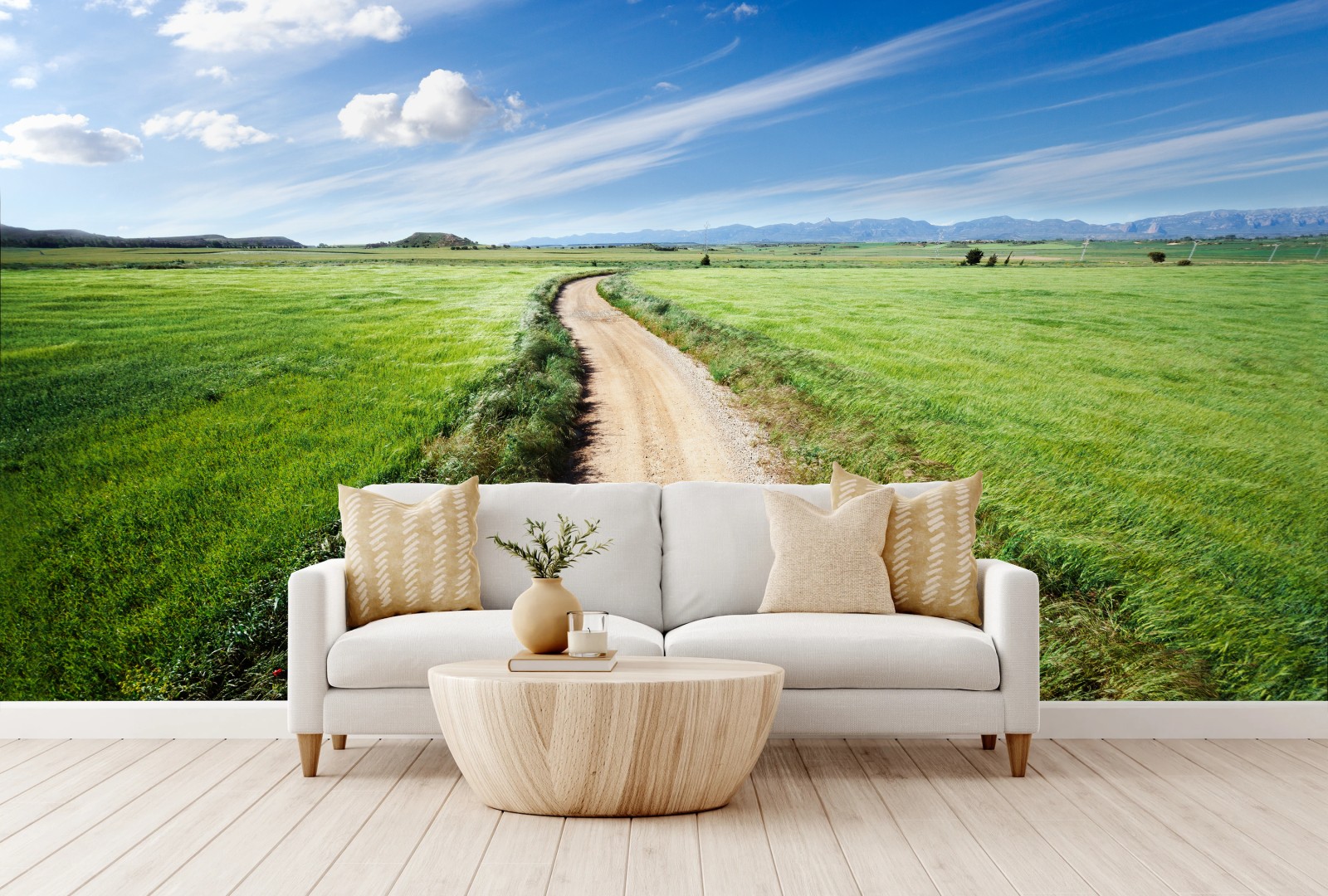 Wall mural Winding country road through green meadows