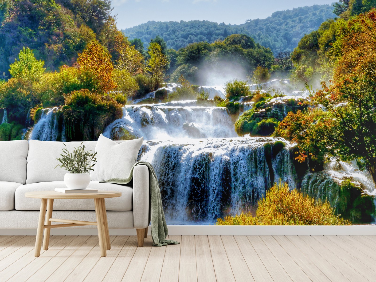 Wall mural Cascading waterfall in lush forest