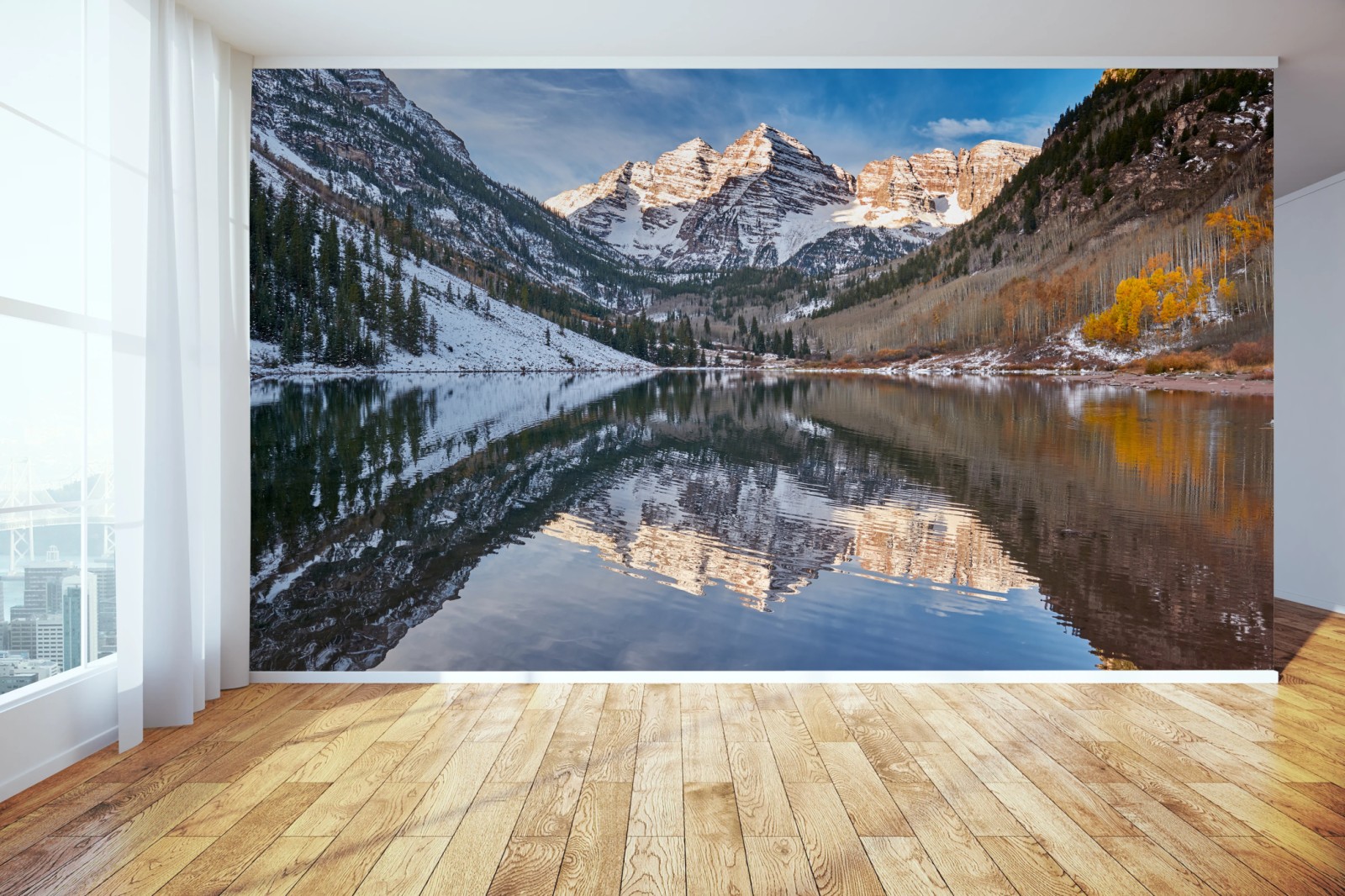 Wall mural Serene alpine lake reflecting snow-covered peaks and autumn trees
