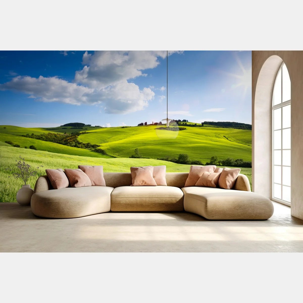 Breathe serenity into your space with a vibrant view of Tuscany's rolling hills bathed in warm sunset light.MoreLess