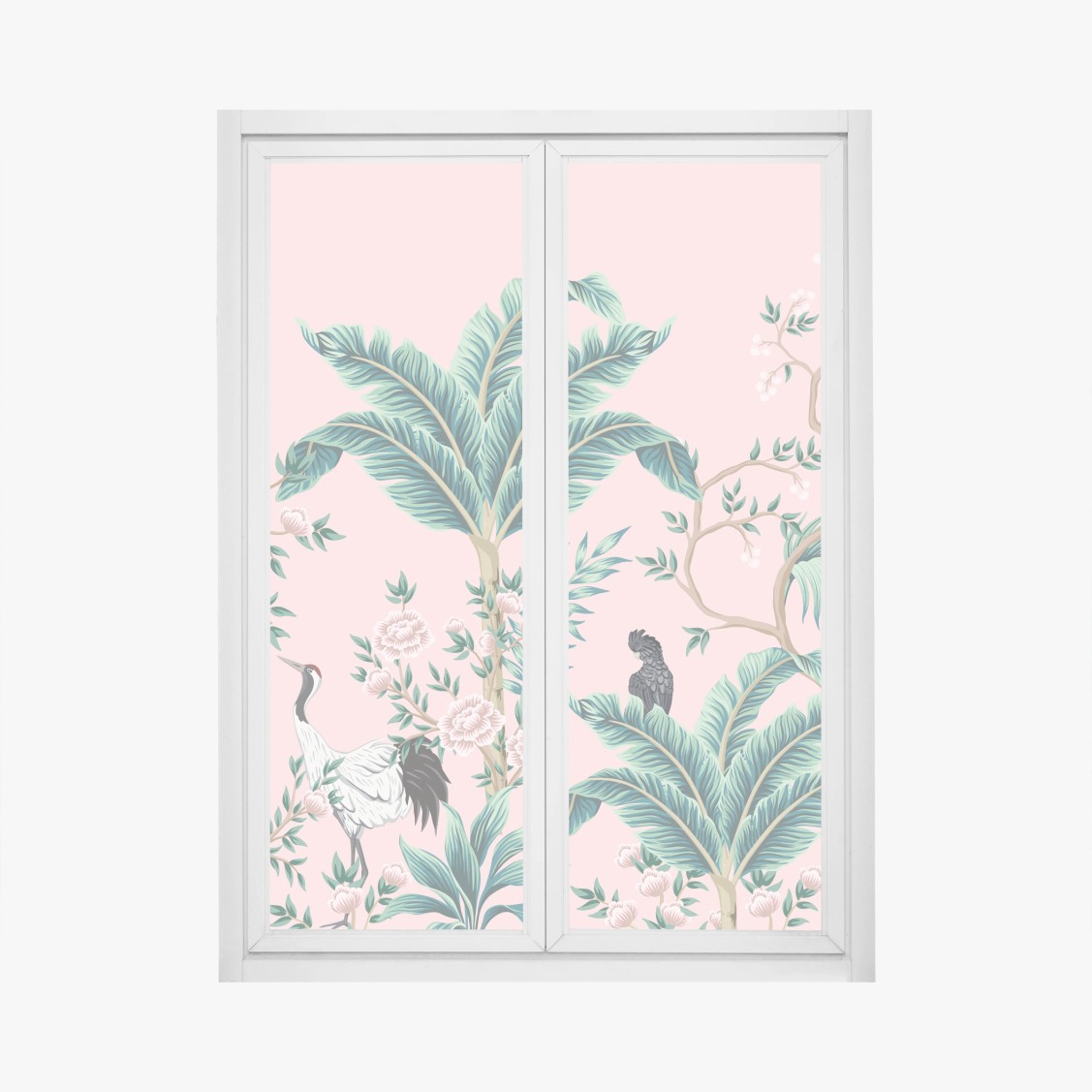 - botanical, tropical, floral, pink, illustration, vintage, birds, banana leaves, wallpaper pattern, cranes